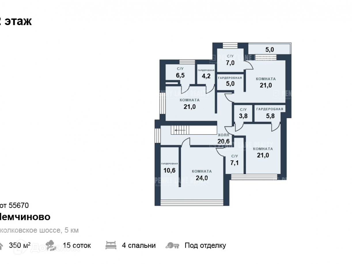 2 этаж: четыре мастер-спальни, в каждой спальне имеется своя ванная комната и гардеробная, из одной спальни есть выход на балкон.