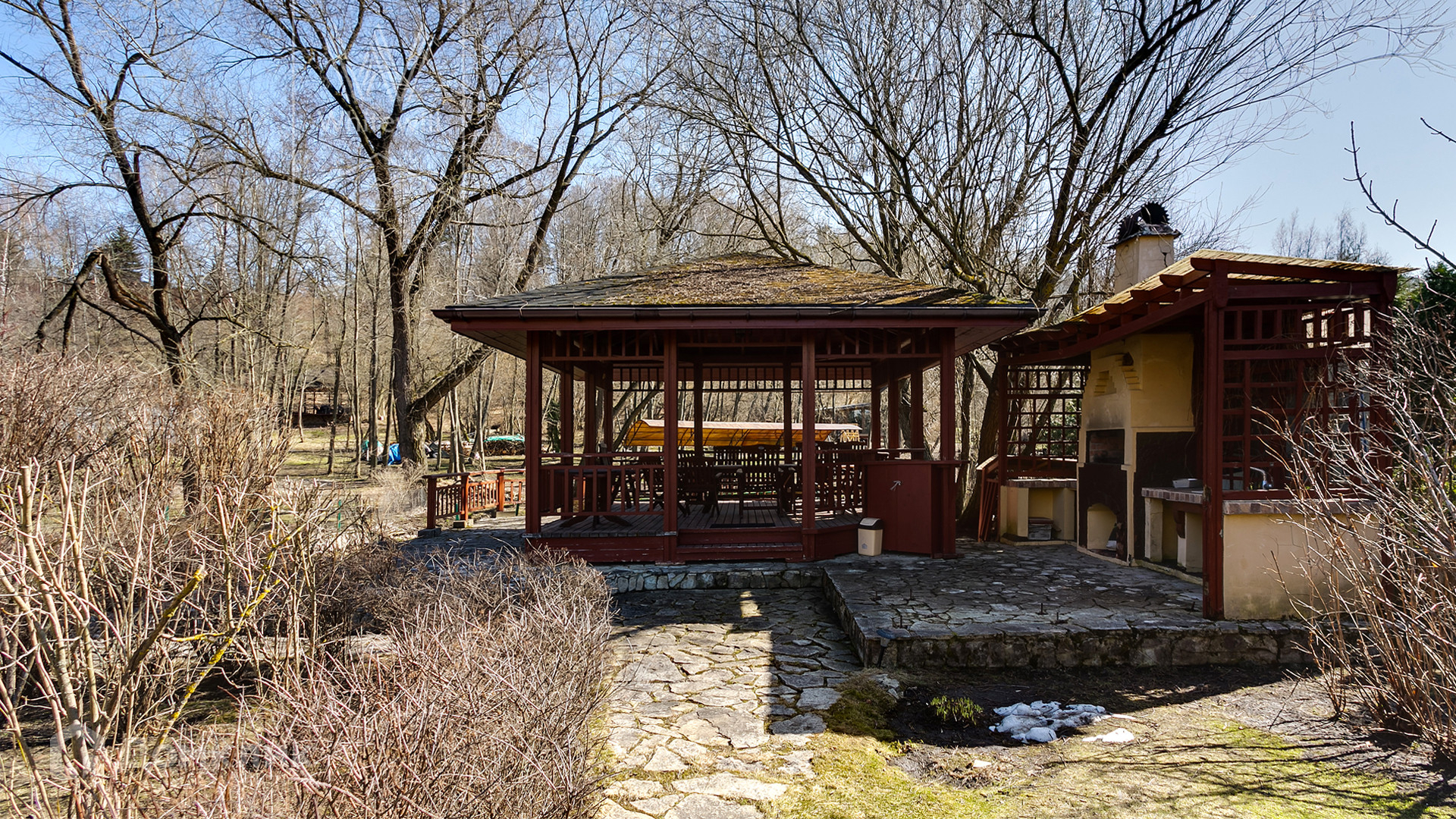 Участок с красивым ландшафтом. Зона барбекю обустроена в непосредственной близости реки Сетунь.