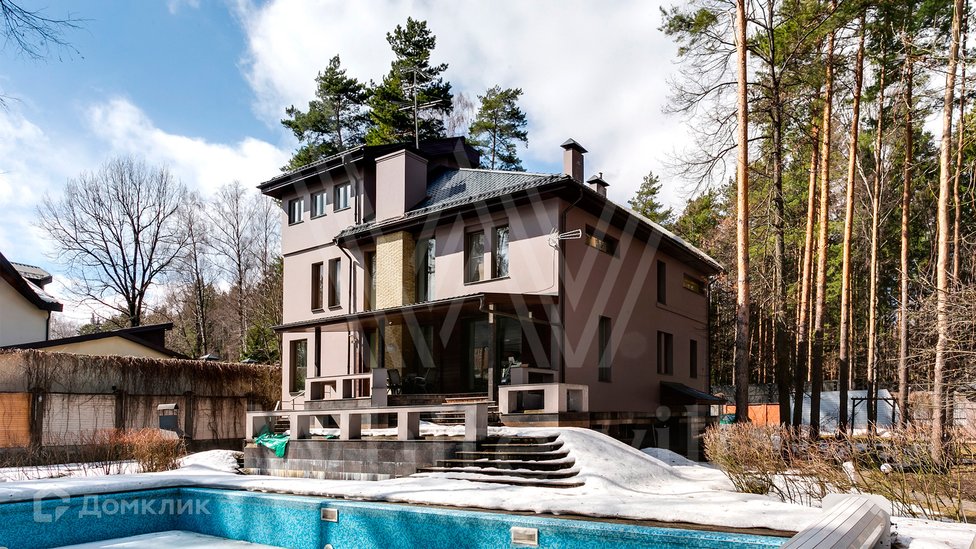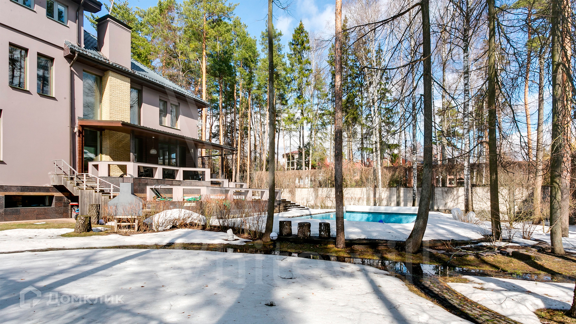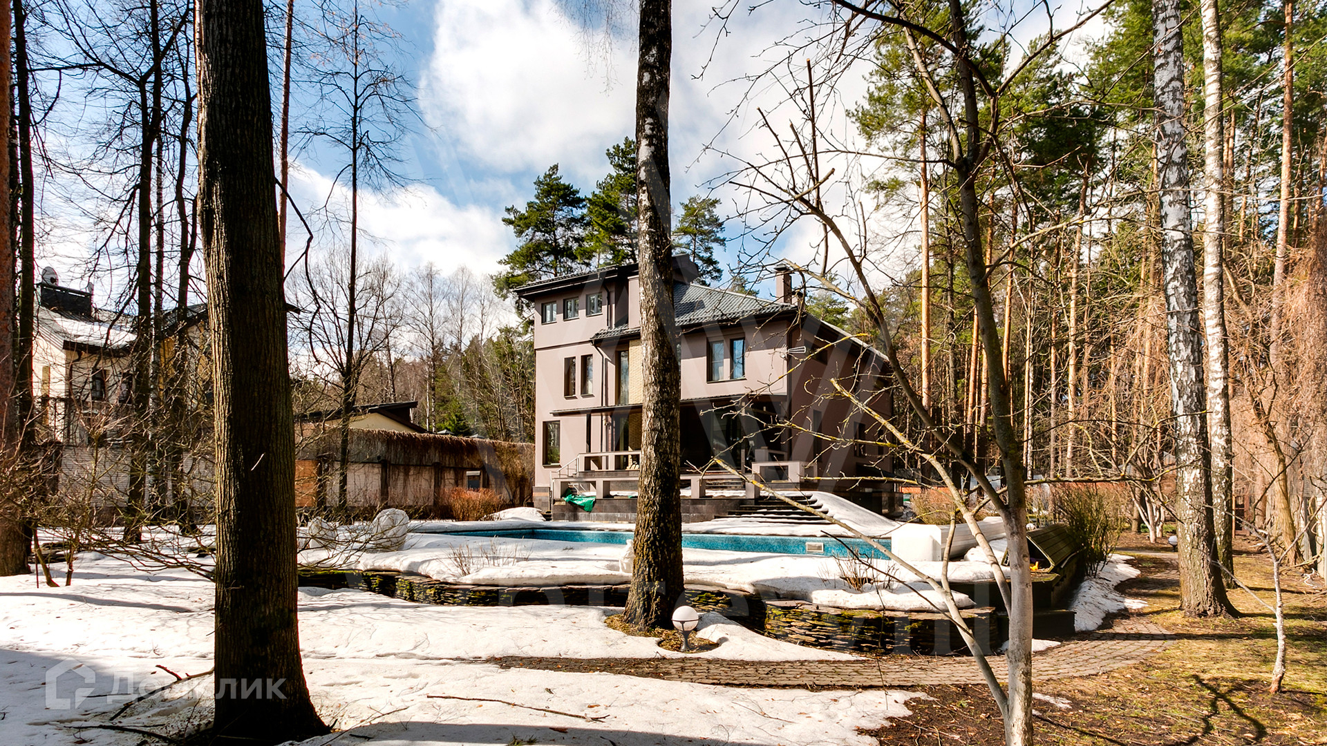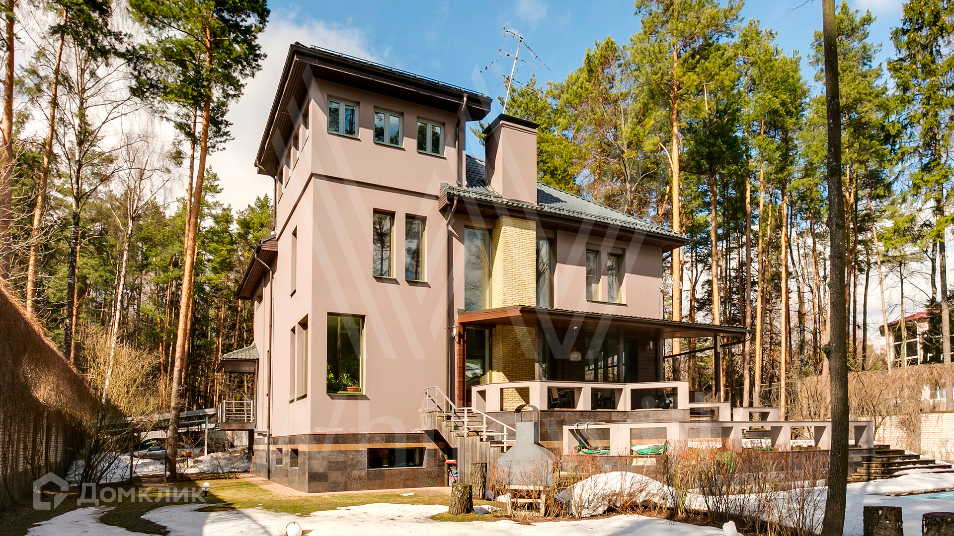 ID 12 390. Немчиново. Загородный дом площадью 650 м² расположен на лесном участке 25 соток. Фасад в европейском стиле облицован светлой розово-коричневой штукатуркой, цоколь украшен камнем. Интерьер выполнен в светлой гамме с добавлением ярких цветовых акцентов. В коттедже спланировали 3 спальни, гостиную с камином, вторым светом и выходом на террасу, кухню-столовую, бильярд, сануну, стилизованный под таверну зал с очагом. На территории предусмотрены открытый бассейн, зона барбекю, навес для 2 машин, гараж и домик для охраны. На участке выполнен ландшафтный дизайн, вымощены дорожки, растут многолетние сосны и березы.
