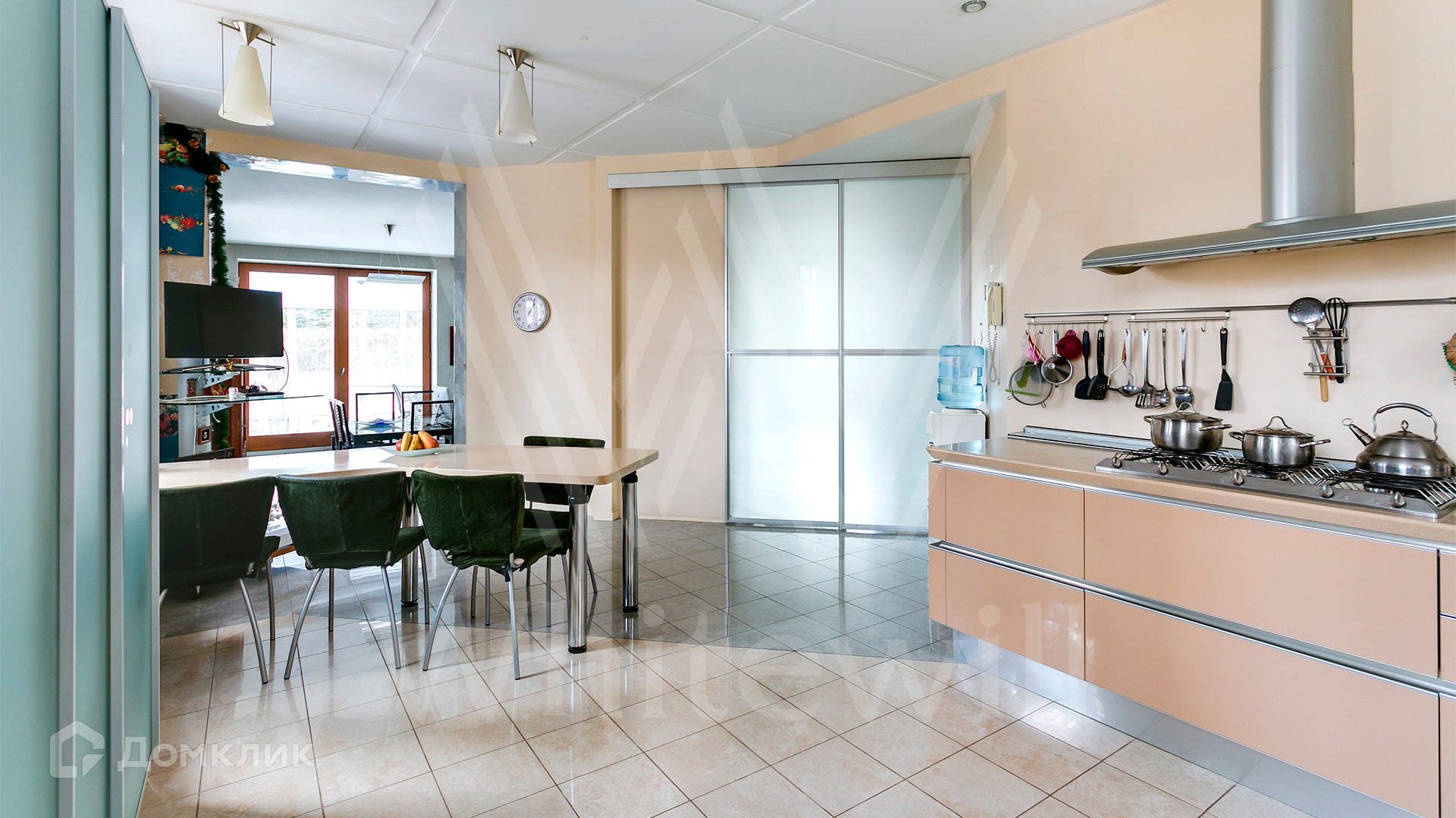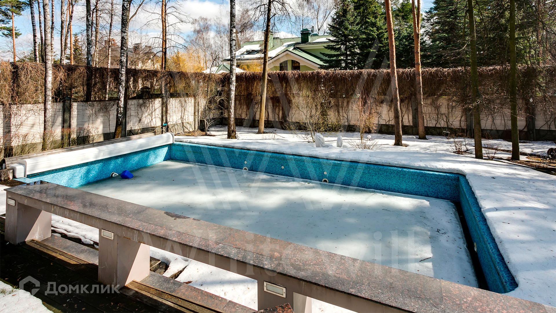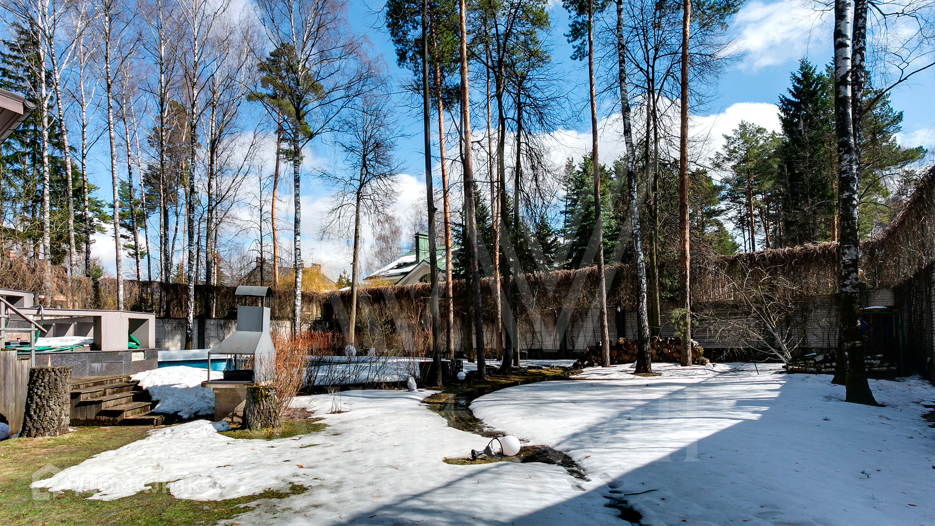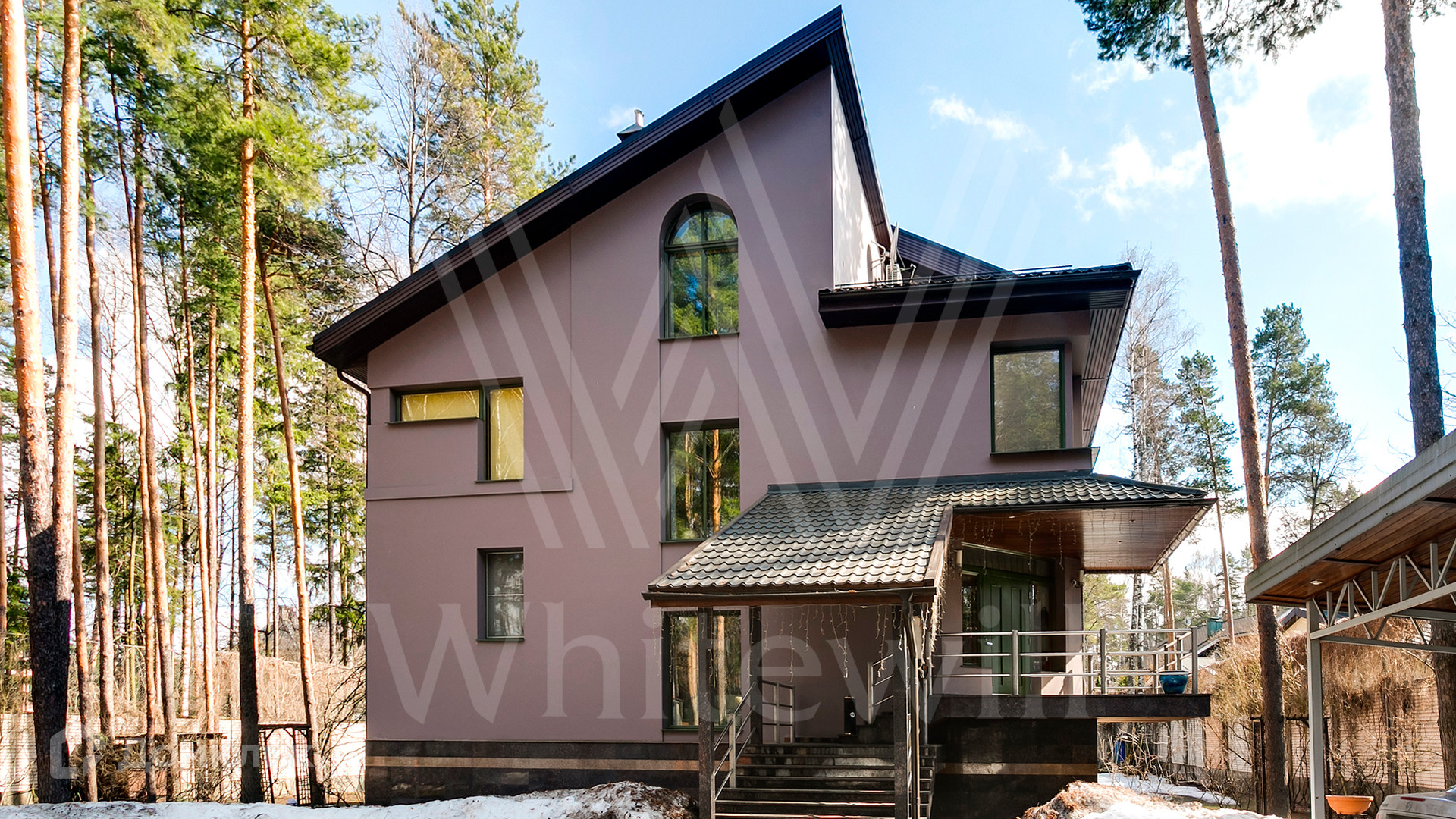 ID 12 390. Немчиново. Загородный дом площадью 650 м² расположен на лесном участке 25 соток. Фасад в европейском стиле облицован светлой розово-коричневой штукатуркой, цоколь украшен камнем. Интерьер выполнен в светлой гамме с добавлением ярких цветовых акцентов. В коттедже спланировали 3 спальни, гостиную с камином, вторым светом и выходом на террасу, кухню-столовую, бильярд, сануну, стилизованный под таверну зал с очагом. На территории предусмотрены открытый бассейн, зона барбекю, навес для 2 машин, гараж и домик для охраны. На участке выполнен ландшафтный дизайн, вымощены дорожки, растут многолетние сосны и березы.