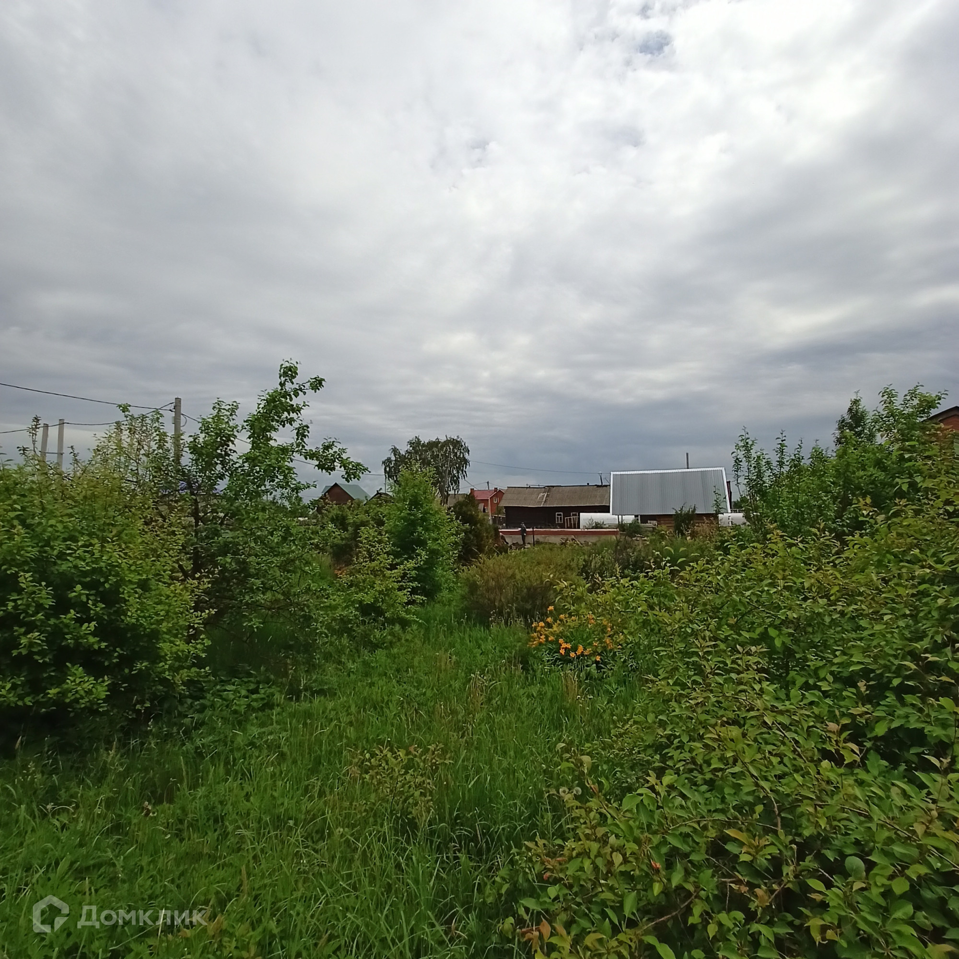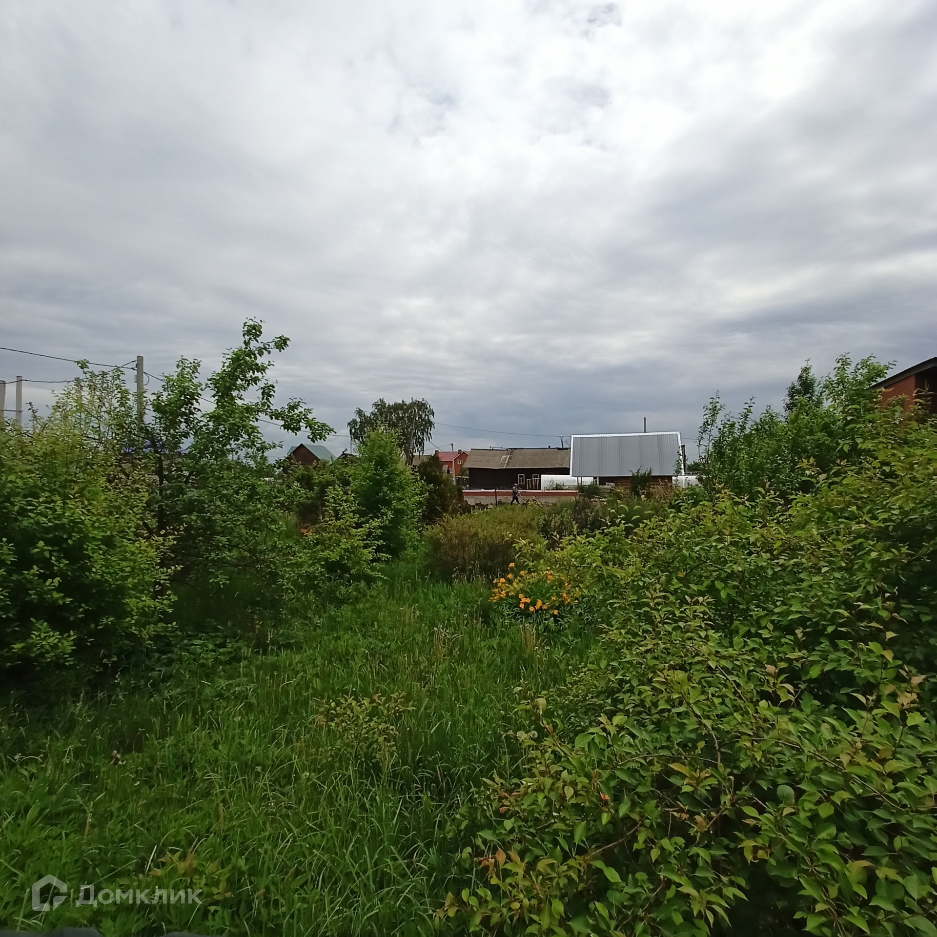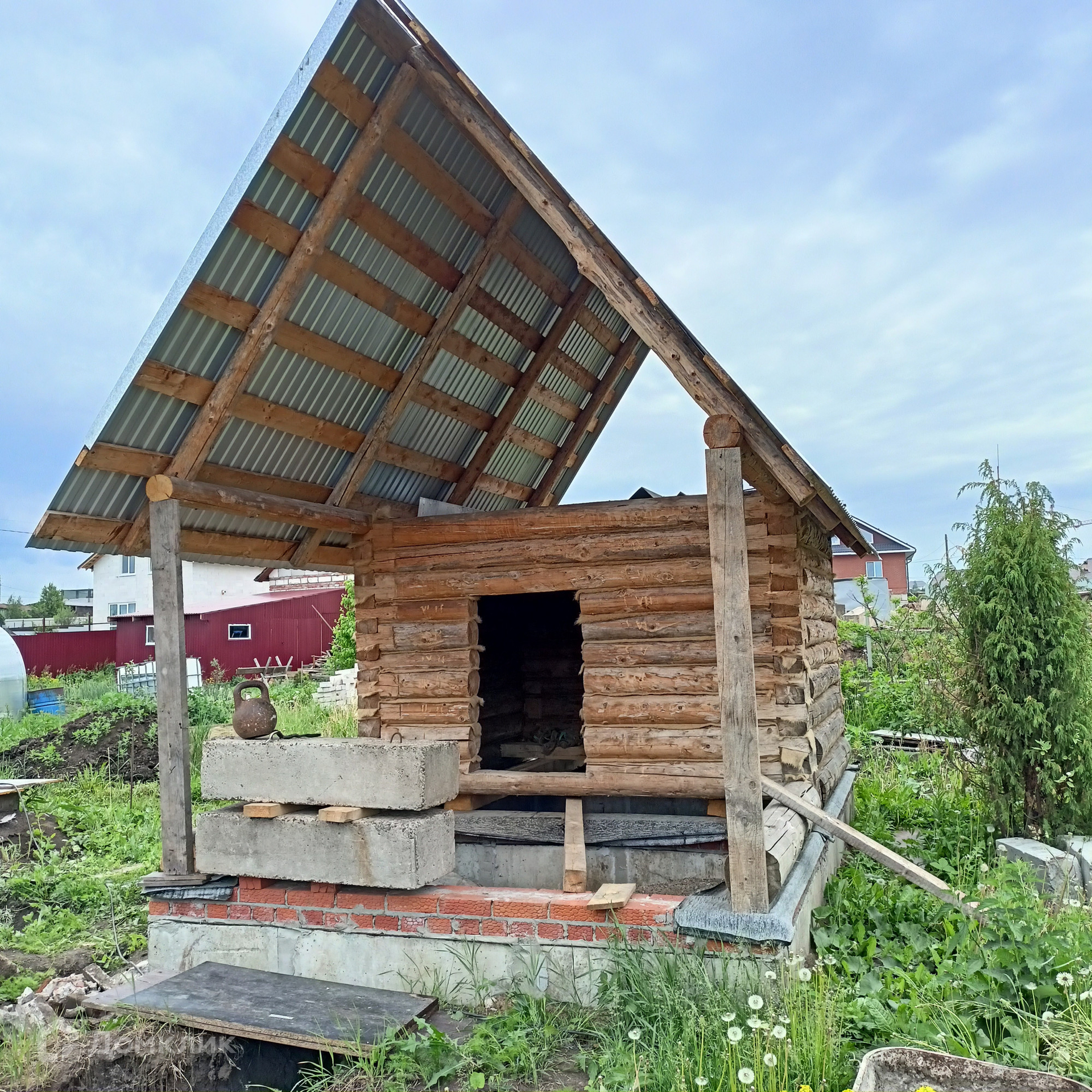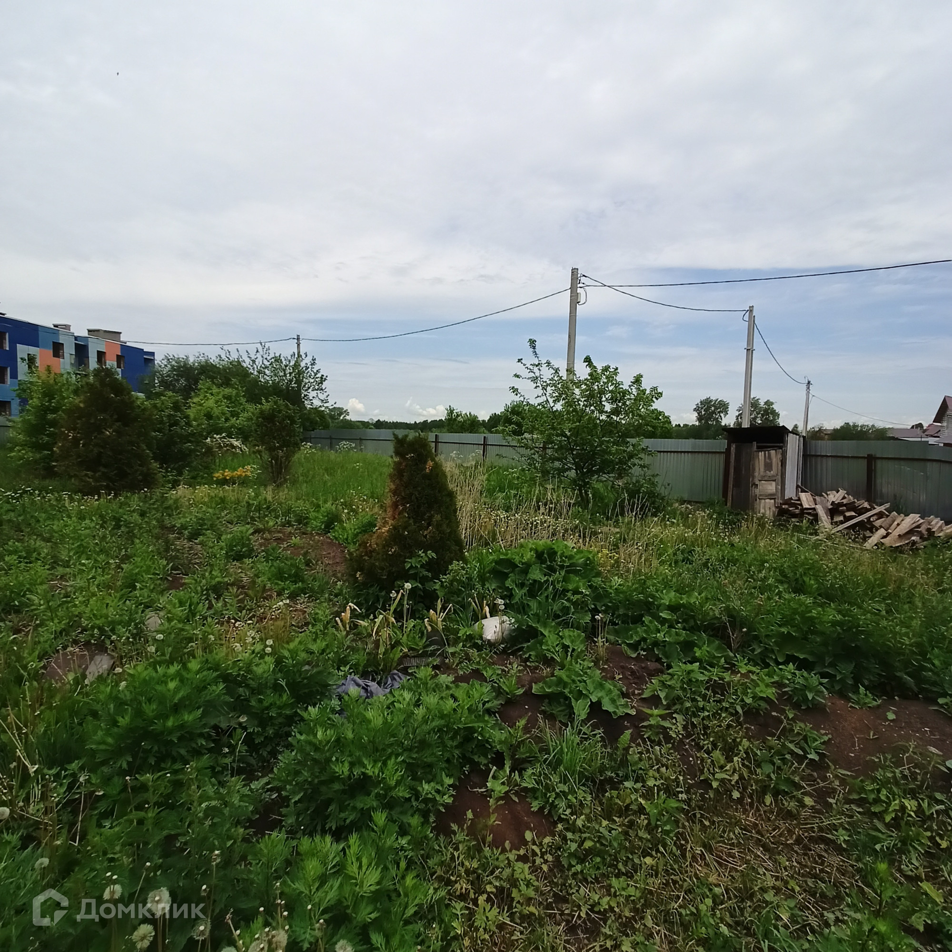 Участок огороже забором из профлиста, есть сруб бани (заведен под крышу) и достаточно места для строительства дома.