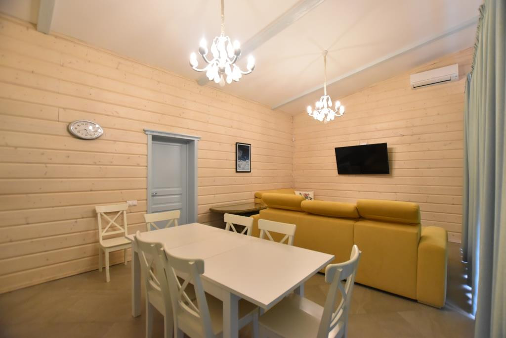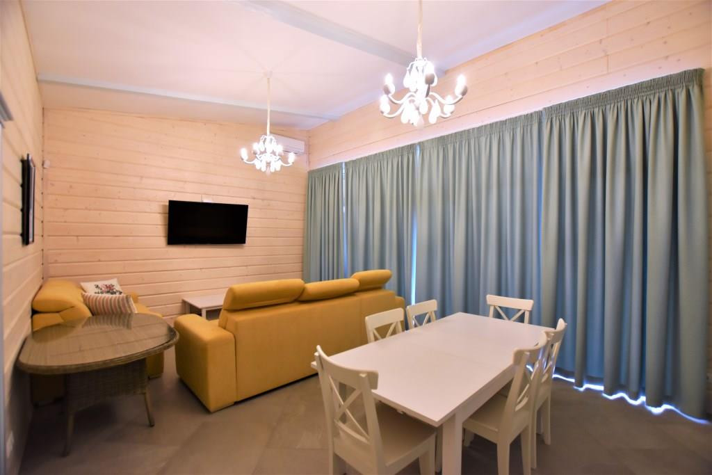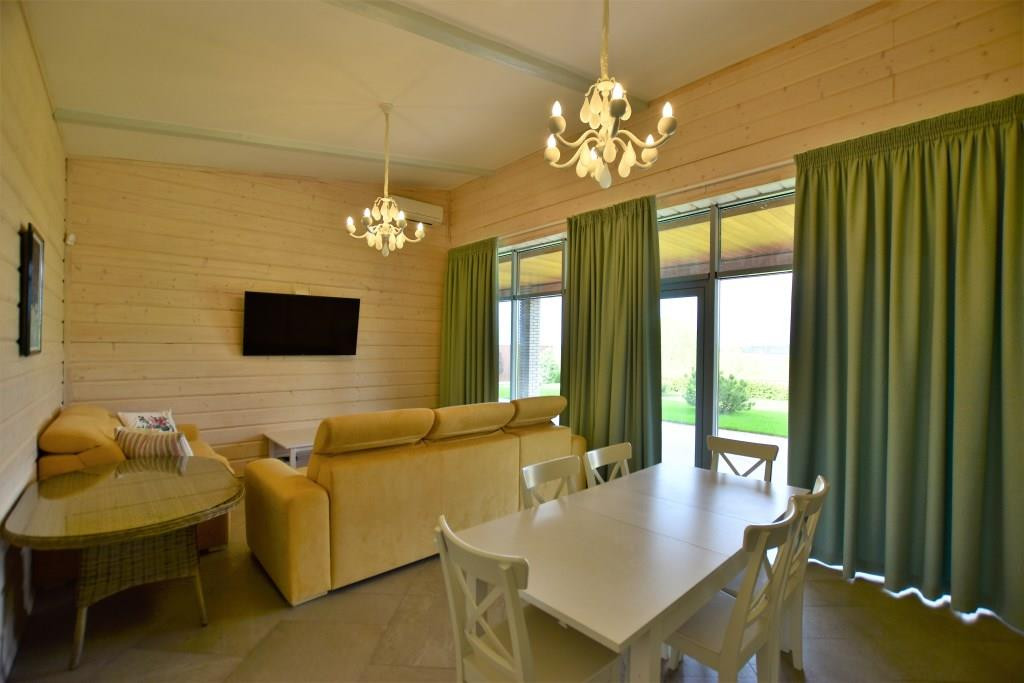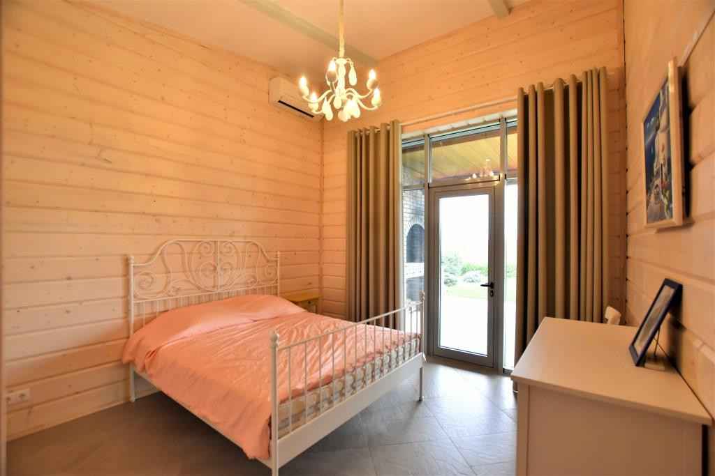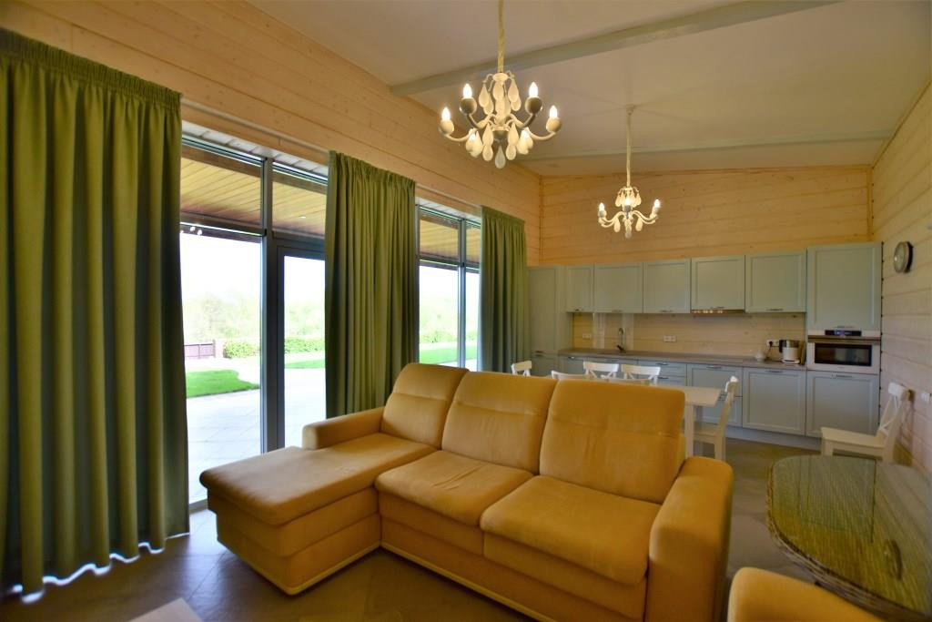 Кухня-гостиная и спальни с панорамным остеклением и выходом на уютную террасу с зоной барбекю с прекрасным видом на живописную территорию. На всех окнах скрытые рольставни.