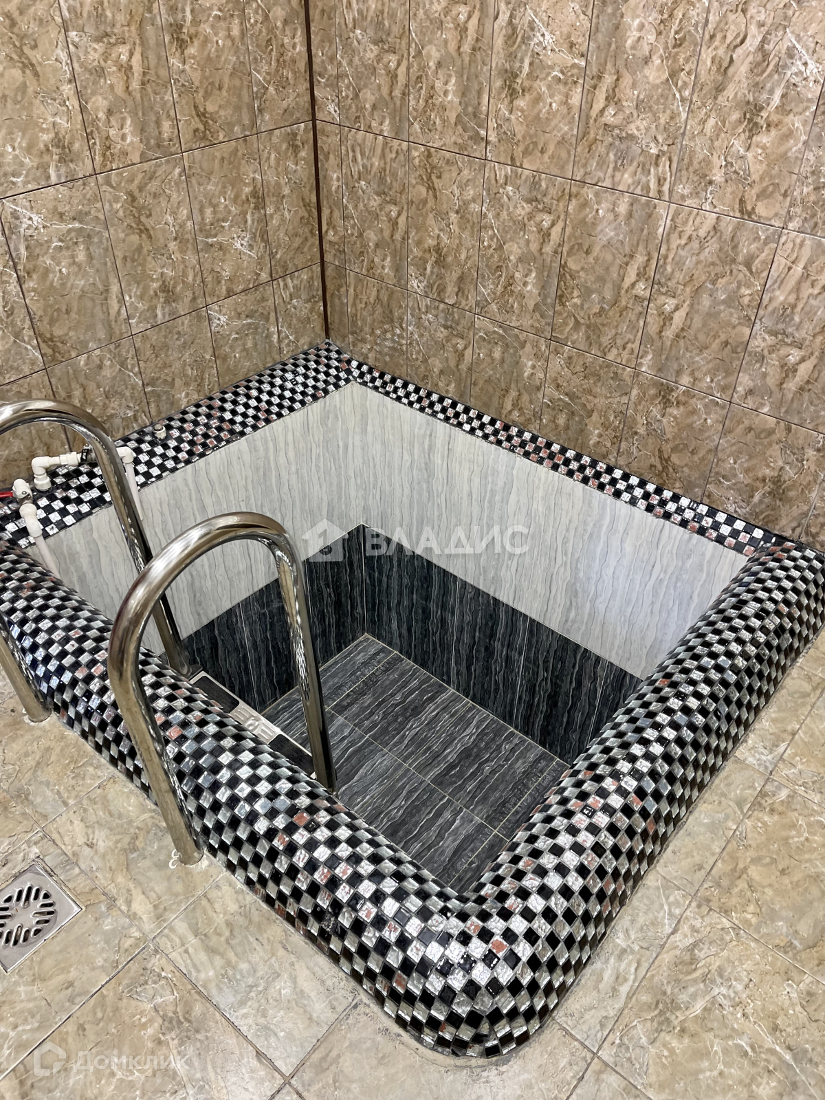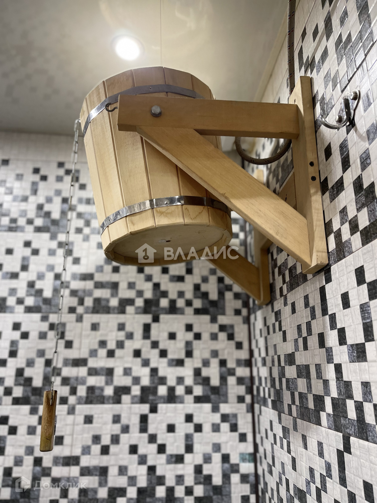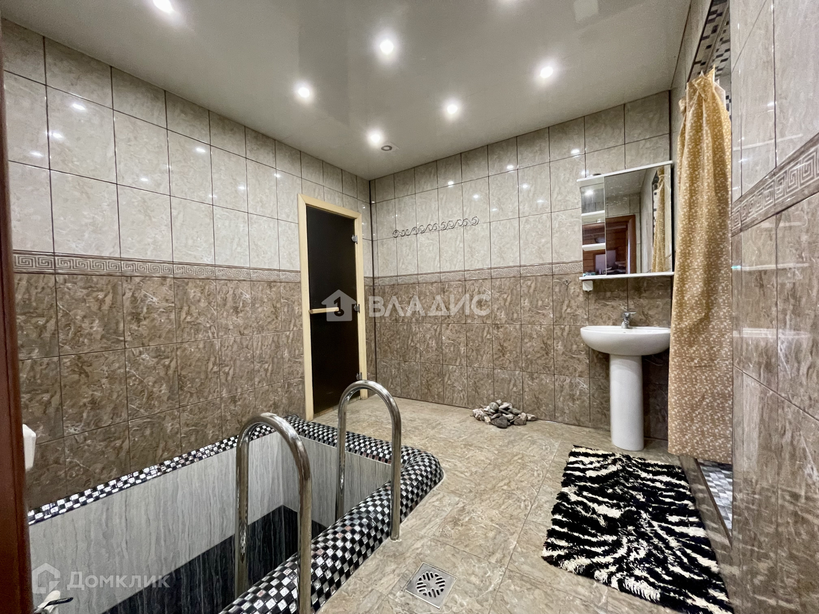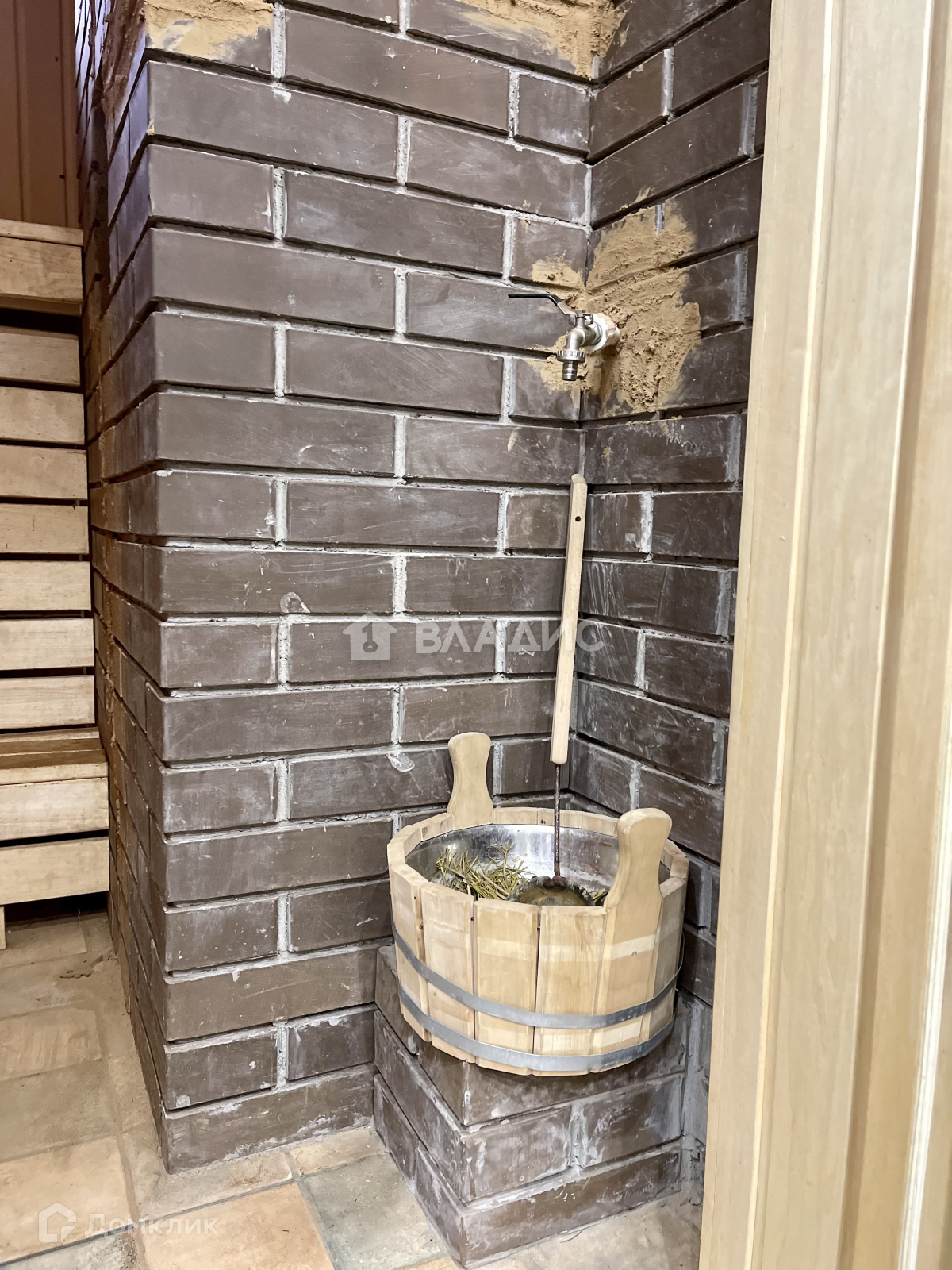 На участке располржена баня в 2 этажа плрщадью 80 кв м. На первом этаже парная, купель, душевая, санузел, комната отдыха и  кухня-гостиная. Везде тёплый пол.  Атмосферу дополняет деревянная резная мебель ручной работы. На 2-м этаже бани расположены ещё 2 комнаты, благодаря чему она так же может служить гостевым домом.  Между этажами есть красивая резная лестница.