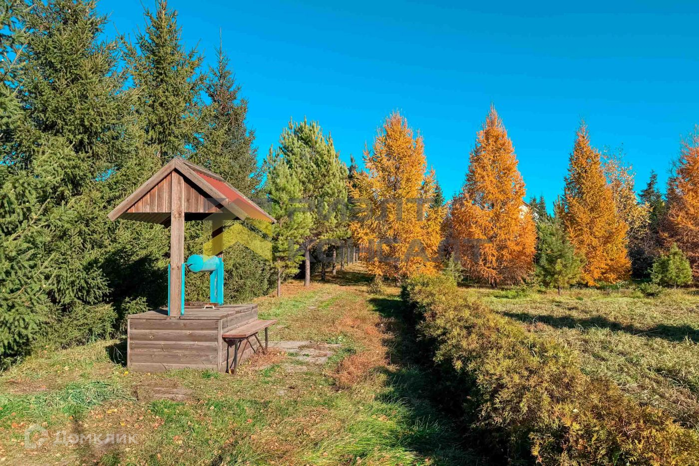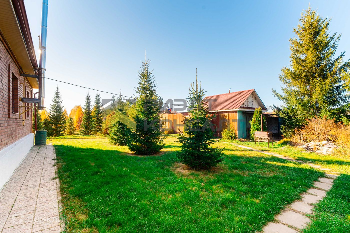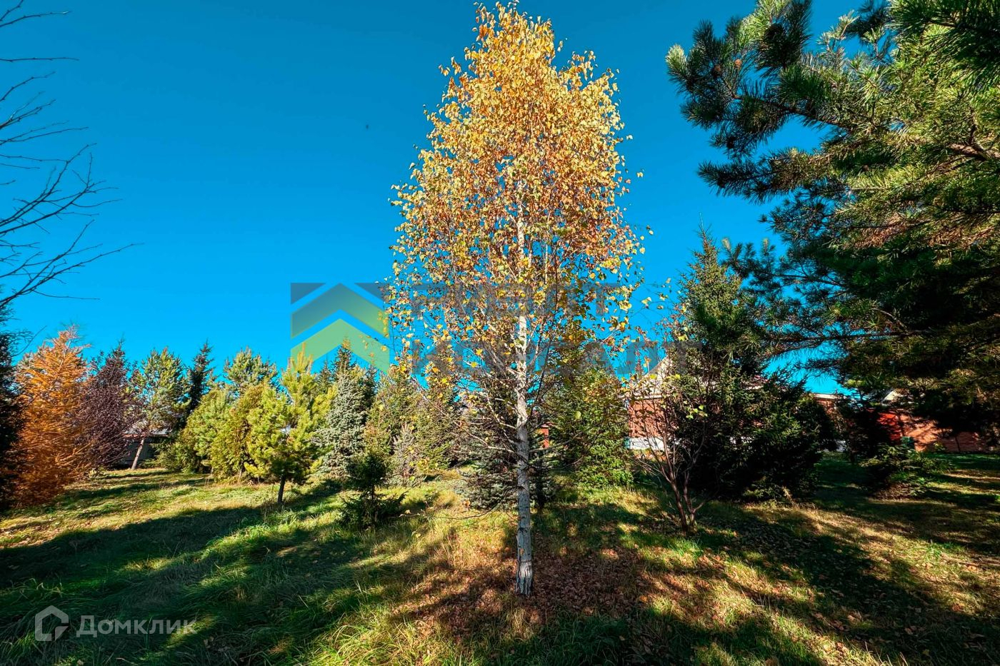 На участке выполнен ландшафтный дизайн. Высажены крупномерные деревья и кустарники: гoлубые ели, кедры, сосны, туи, лиственницы, клен, шаровидные туи, можжевельники, аллея из берез и другие.