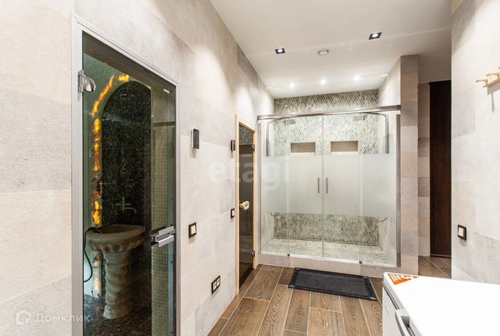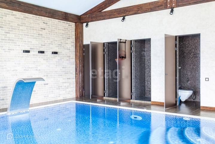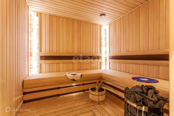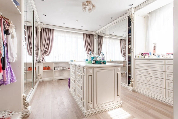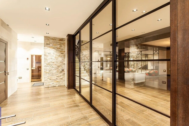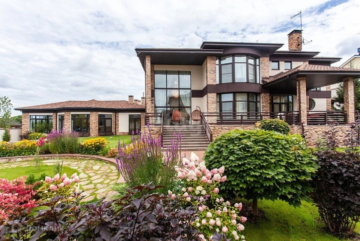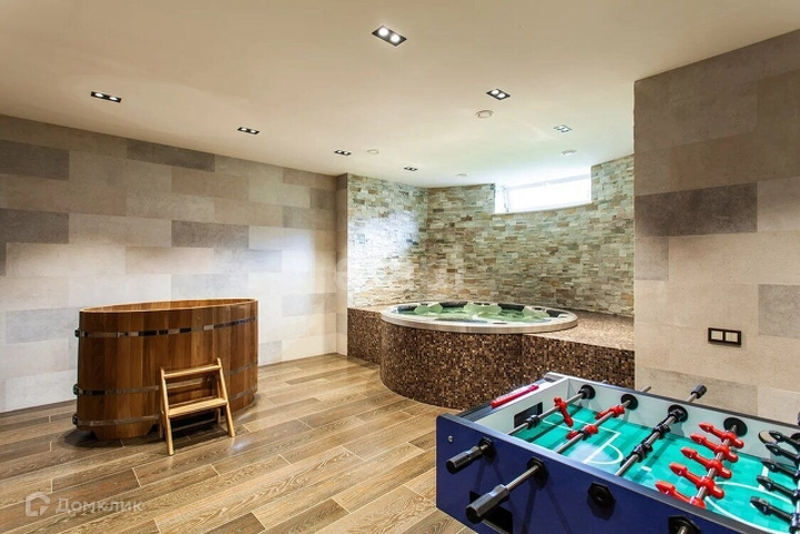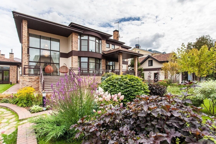-Цоколь: бильярдная, постирочная, котельная, зал для занятия фитнесом, комната отдыха, сауна, хамам, серверная; -1 этаж: гардеробная для верхней одежды, холл, гостевой су, гостиная с камином, кухня, столовая, террасы, две спальни. -2 этаж: холл, основная спальня с ванной комнатой и двумя гардеробными комнатами, гостевая спальня, детская c с/у. -Мансарда: кабинет, большое пространство под гардероб, библиотека.