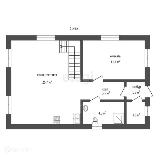 2 с/у, гостиная с кухней, котельная.