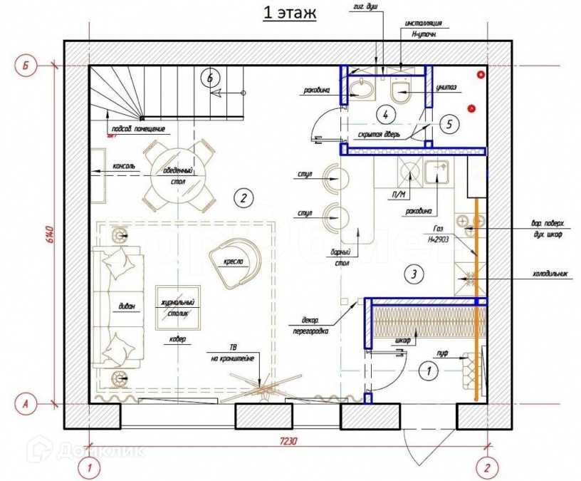1 эт. Коридор, гардероб, просторная кухня гостиная, с/у