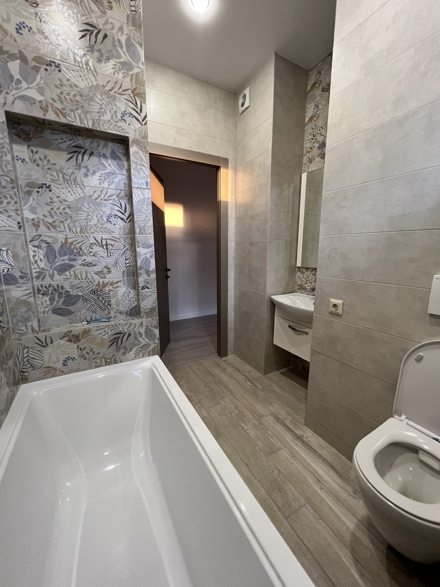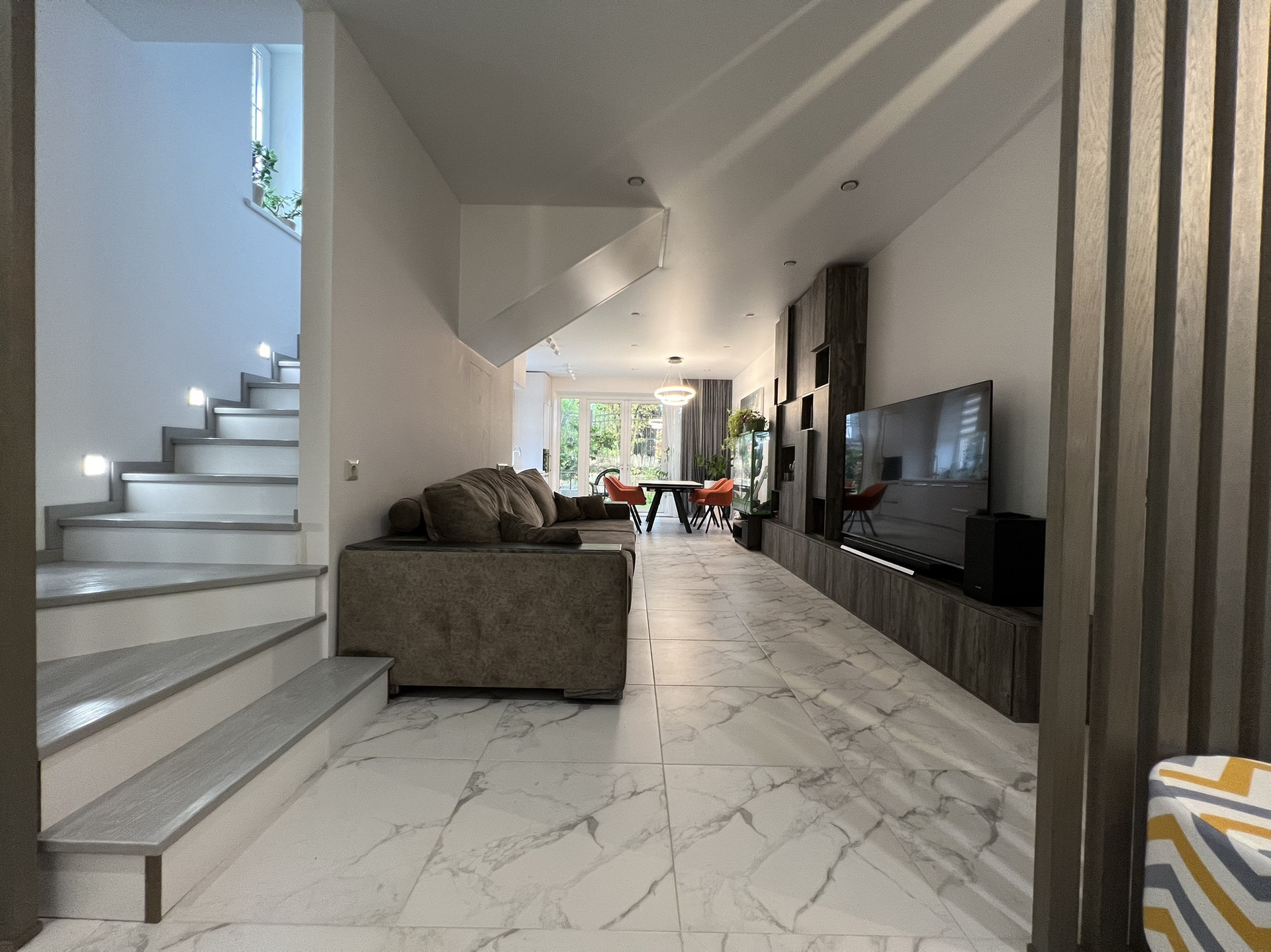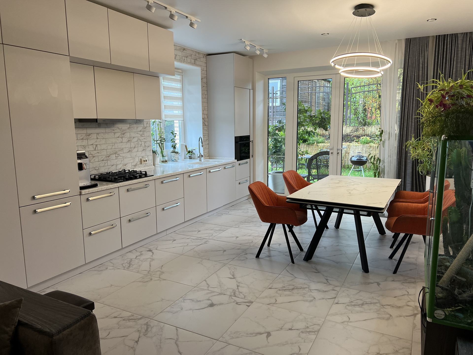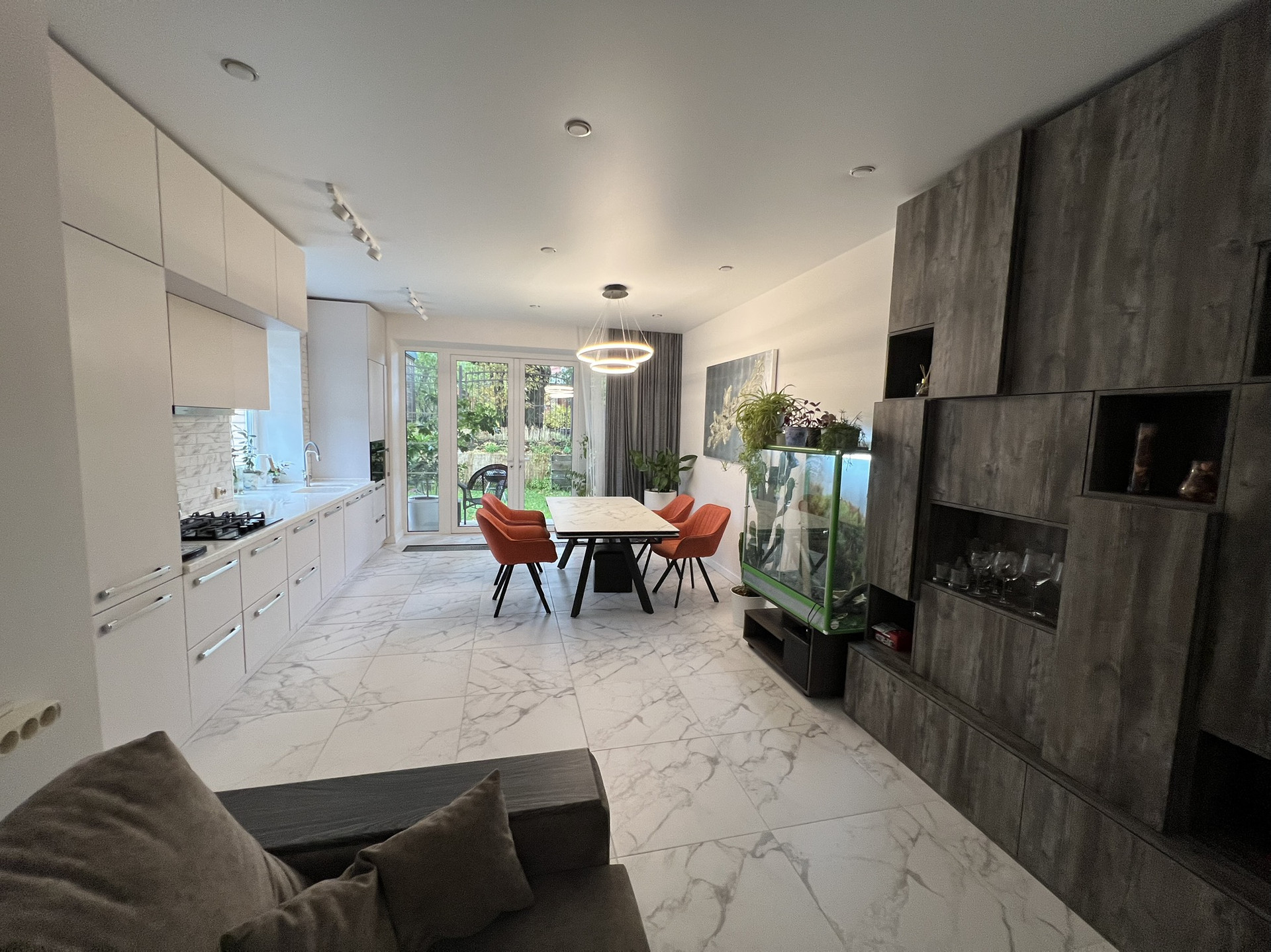 1 этаж - прихожая-гостиная-кухня - три в одном. Также на первом этаже санузел и небольшая инженерная комната. Выход с кухни на свой участок. Площадь участка 0.35 соток (больше по факту в поселке нет, большинство таунхаусов без наличия земельного участка).