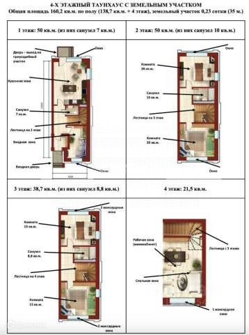 Общая площадь 160,2 кв.м. по полу (138,7 кв.м. по документам + четвертый полноценный этаж с кроватью, зоной отдыха, телевизором и рабочим местом).