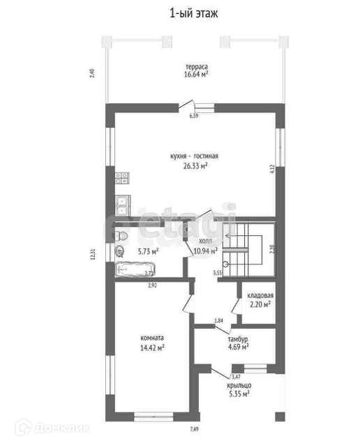 На 1 этаже просторная кухня- гостиная с выходом на террасу, комната, котельная, с\у + тёплые полы на 1 этаже