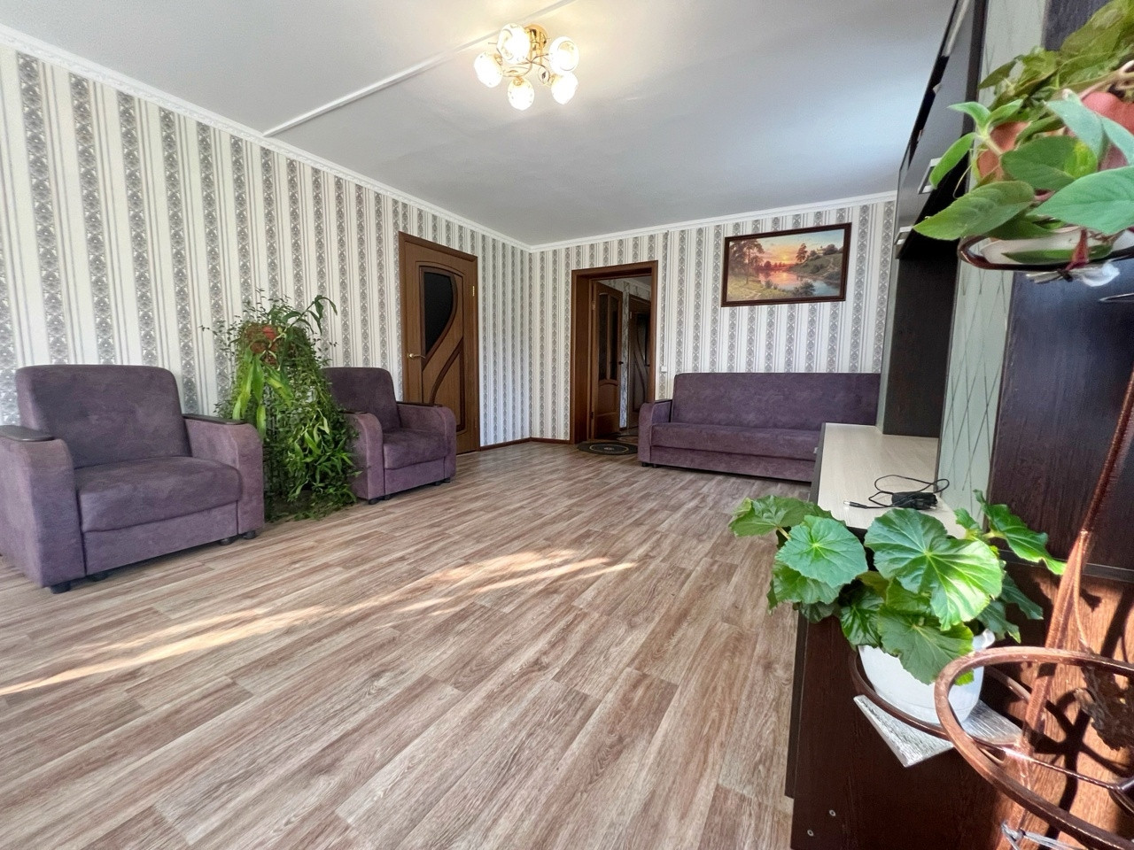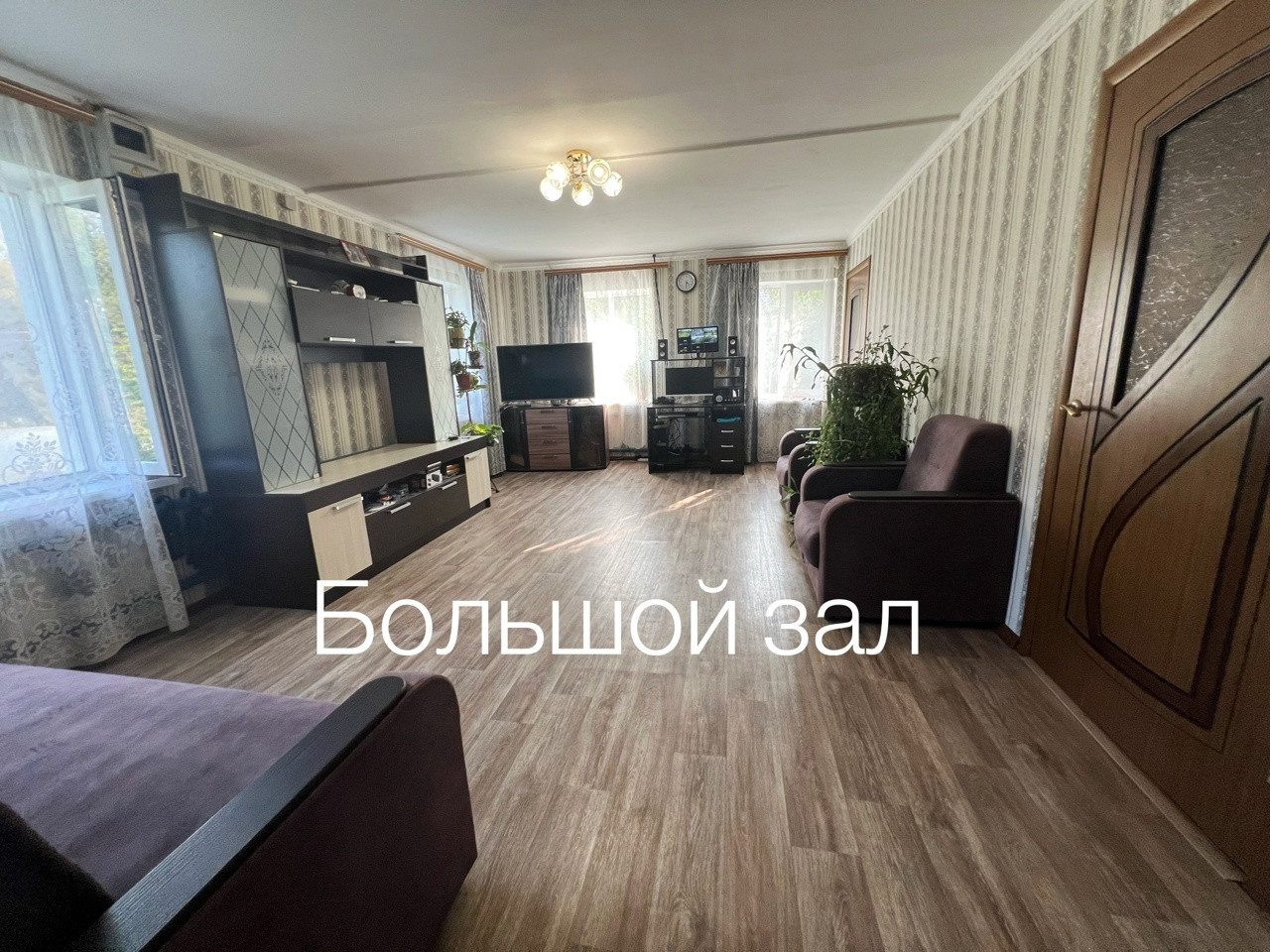 Большой зал 22 кв. м и простную кухню-гостинную  для большой семьи.