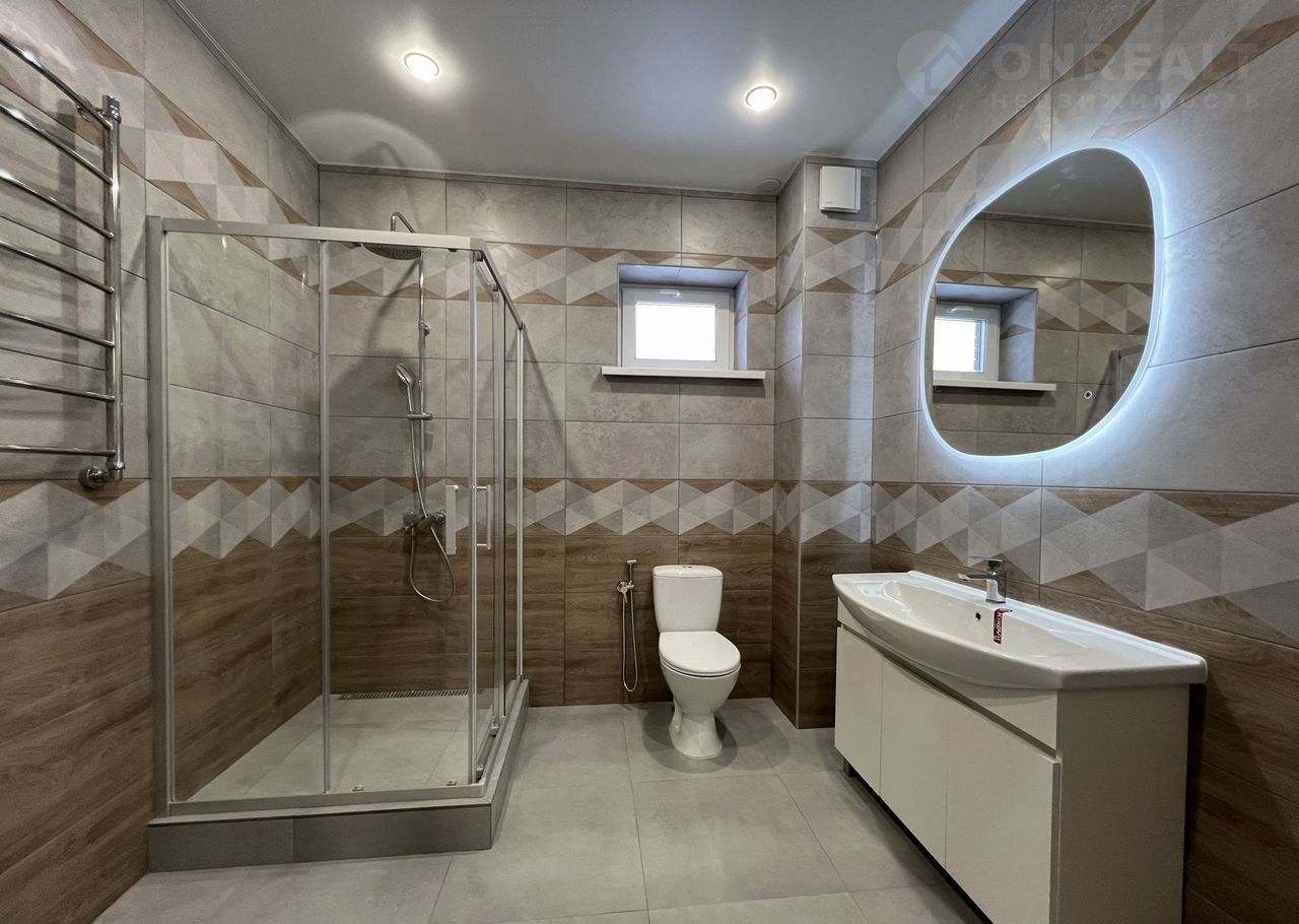 Фундамент - ленточный армированный с монолитной плитой; Материал дома - газобетонный блок - 300 мм + кирпич 12 мм; Межкомнатные перегородки - газобетонный блок - 200 мм; Монолитное перекрытие между этажами - 200 мм; Внутренняя отделка дома - стены подготовлены под обои; Полы - плитка/ламинат; Потолок - натяжной; Окна - двухкамерные стеклопакеты 70 профиль с поворотно-откидным механизмом; Кровля - утепление 200 минватой, организован технический доступ с мансардной лестницей; Крыша - многослойная мягкая кровля; Установлена водосточная система и снегозадержатели; На крыльце нескользящий карамогранит.