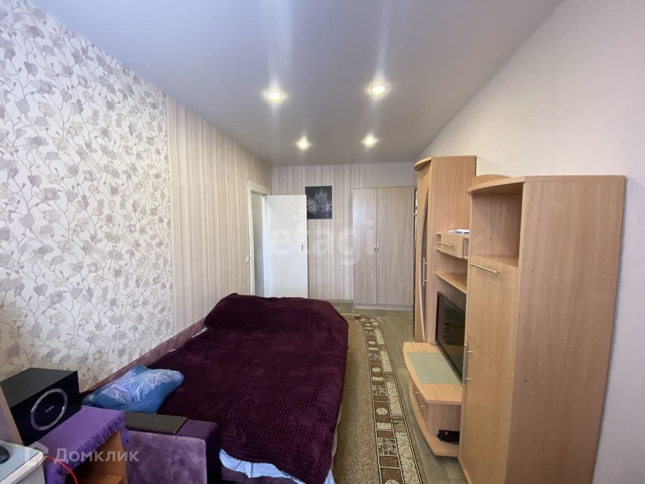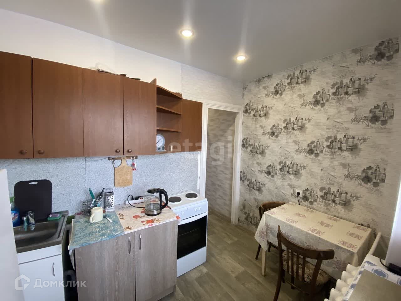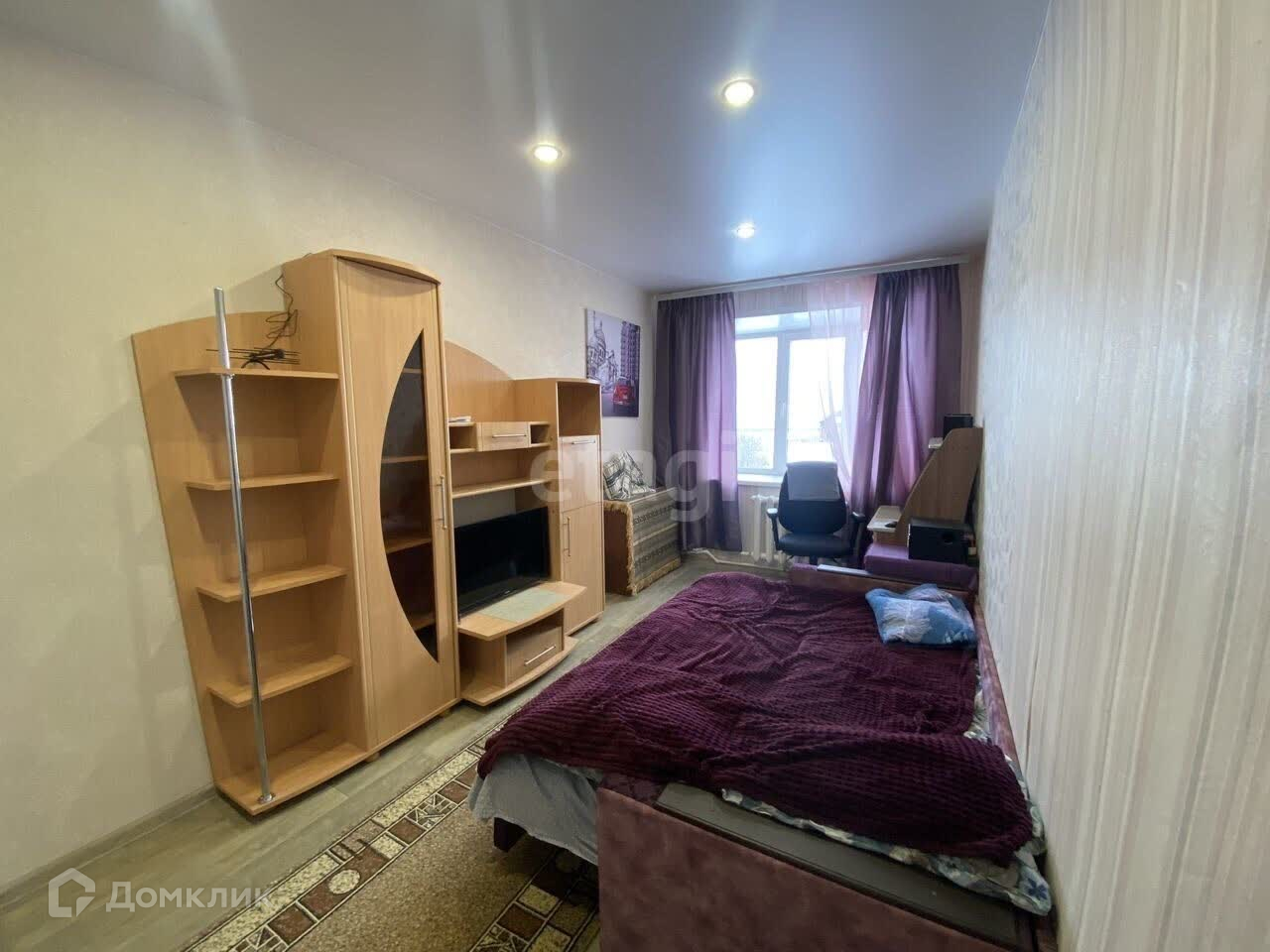 окна ПВХ, натяжной потолок, новый линолеум, поклеены новые обои, остается мебель и техника.