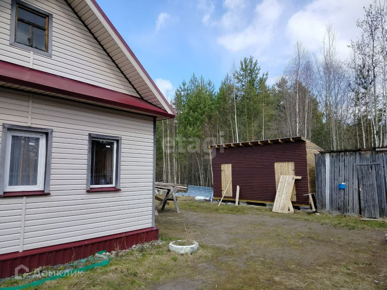 Дом построен на бетоноленточном фундаменте, стены выполнены из бревна с утеплением, дом обшит сайдингом. Крыша покрыта профнастилом для долговечности и надежности. Частично установлен забор из профнастила.