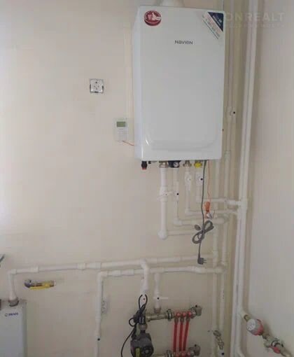 В дом уже заведены все коммуникации: электричество, вода, отопление, канализация. Газ проходит по границе участка.