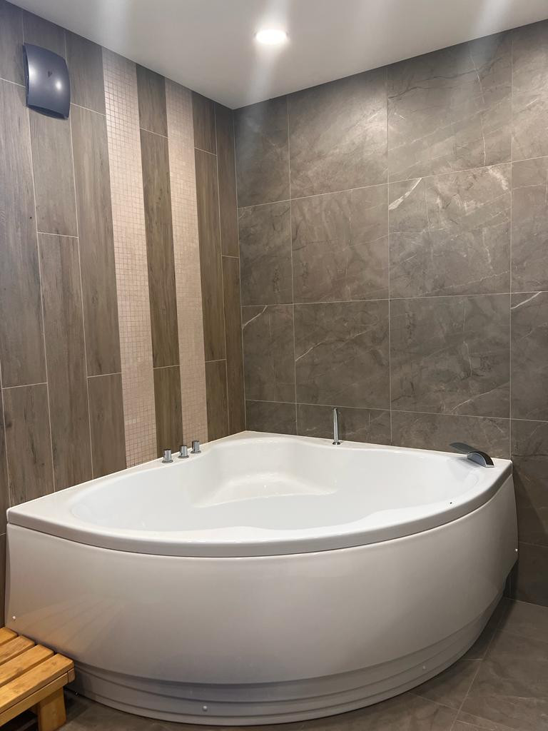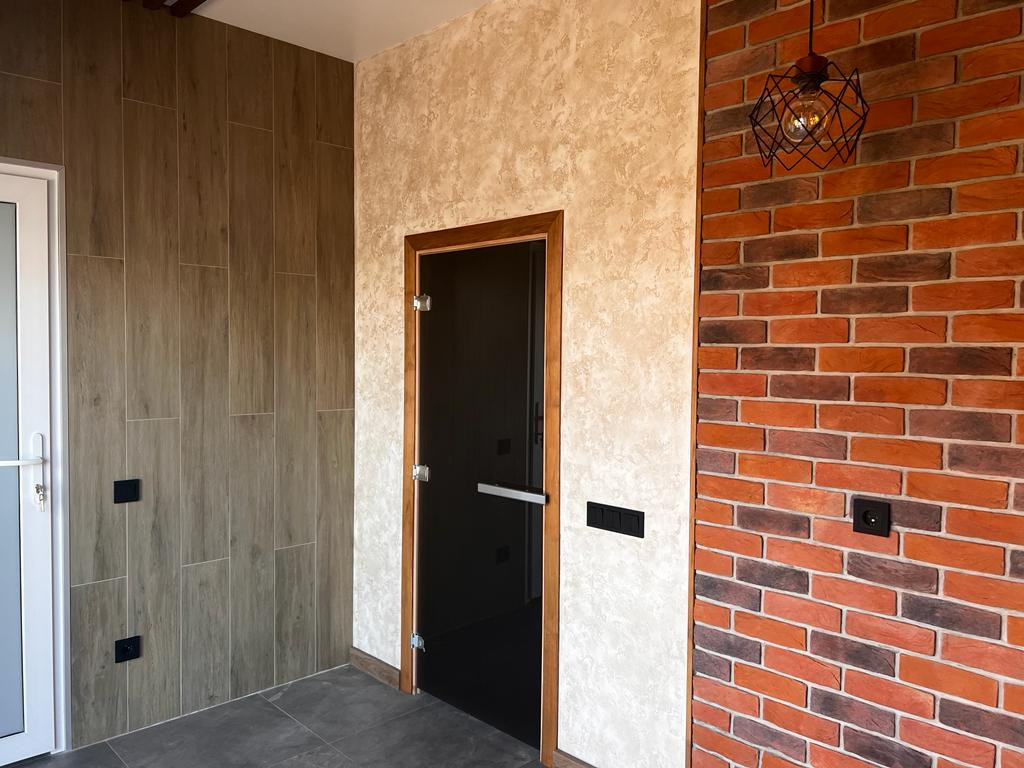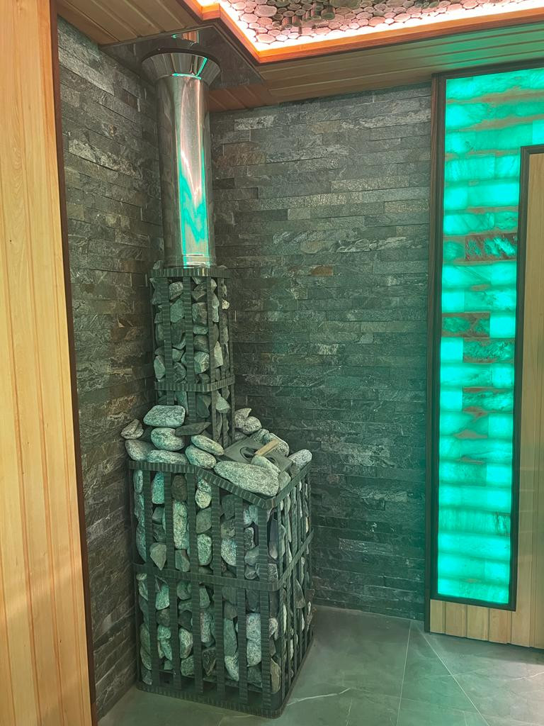 Хозблок с баней 13м на 6м. Баня площадью 45 м2. Сделана по современным технологиям. Имеется подсветка. Теплые полы, стены местами выложены гималайской солью. Потолок из необработанного можевельника. Поэтому в помещении стоит приятный запах смолы, запах свежего можевельника.