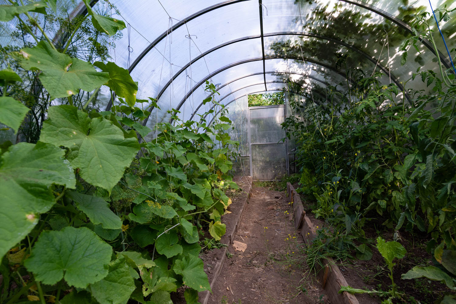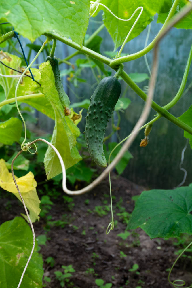 На участке есть теплица с огурцами и помидорами, в открытом грунте посажены кабачки, зелень, яблони, сливы, смородина.