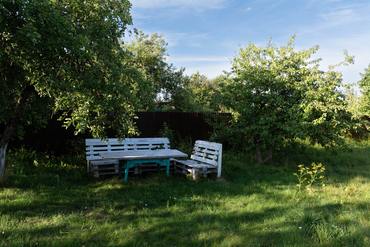 На участке расположена зона отдыха стол с сиденьями для тех кто любит проводить семейный ужин на природе.