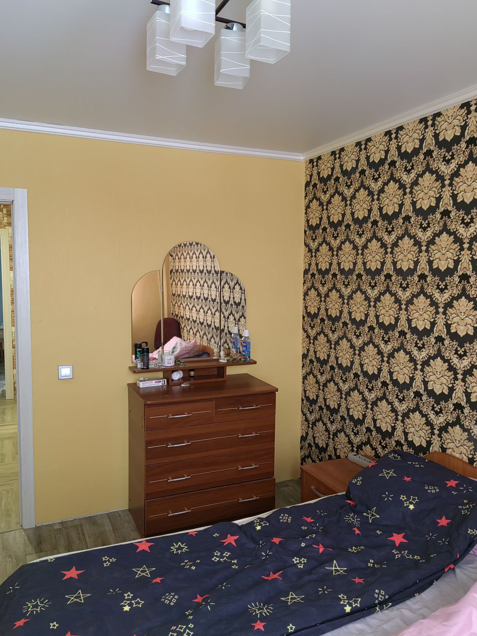Санузел раздельный, полностью отделан дорогой качественной плиткой Kerama Marazzi, на полу во всей прихожей и кухне керамогранит, в зале качественный ламинат, в спальне линолеум. На кухне установлен дорогой гарнитур, индукционная варочная поверхность Hotpoint Ariston итальянской сборки, вытяжка, мойка из искусственного камня. Во всех помещениях натяжные потолки.