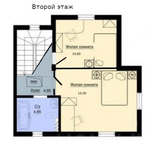 На втором этаже - 2 комнаты 11м2 и 17 м2, санузел и лестница на большой чердак.