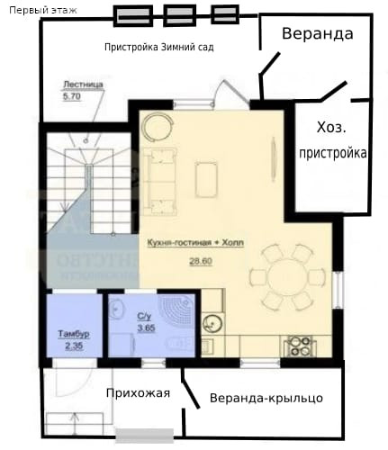 На первом этаже - прихожая, холл, санузел, кухня/гостиная, "комната/зимний сад" с выходом на веранду и выходом в сад.