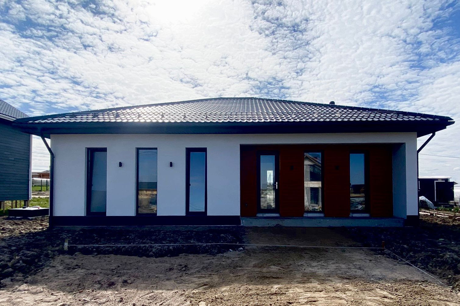 Дом в КП Петергофское имение с предчистовой отделкой. Фундамент 250мм. Стены внешние 250мм+50мм(утеплитель). Перегородки 150мм. Штукатурка с элементами планкена. Окна Рехау 70 профиль (ламинированные). Кровля-металлочерепица без утепления. Перекрытия-утепление 200 каменной ватой. Фасадные светильники. Тех. помещение-кафель. Стены оштукатурены. Водяные тёплые полы (полусухая стяжка). Септик Астра-5. Электрокотёл STOUT. Типовая электрика. Дом продаётся от юридического лица. Подходит под сельскую, льготную, семейную и IT ипотеку. Дом с отделкой фасада, контрастные белый и тёмный цвета. Вытянутые по вертикали окна придают дому индивидуальный, стильный вид.Вблизи КП имеются магазины, кафе, аптеки, пункт OZON, школа, дет. сад. Дом находится в 2-х км от Петергофа. Дом на стадии строительства, окончание работ июль, август.  Участок входит в стоимость. Уважаемые покупатели ждём вас на просмотры.