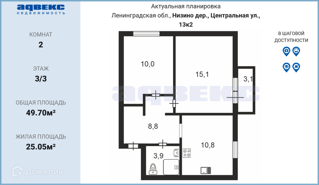 2-комнатная квартира, 49.7 м2, этаж 3 / 3, на продажу в деревне Низино, Центральная улица, 13к2