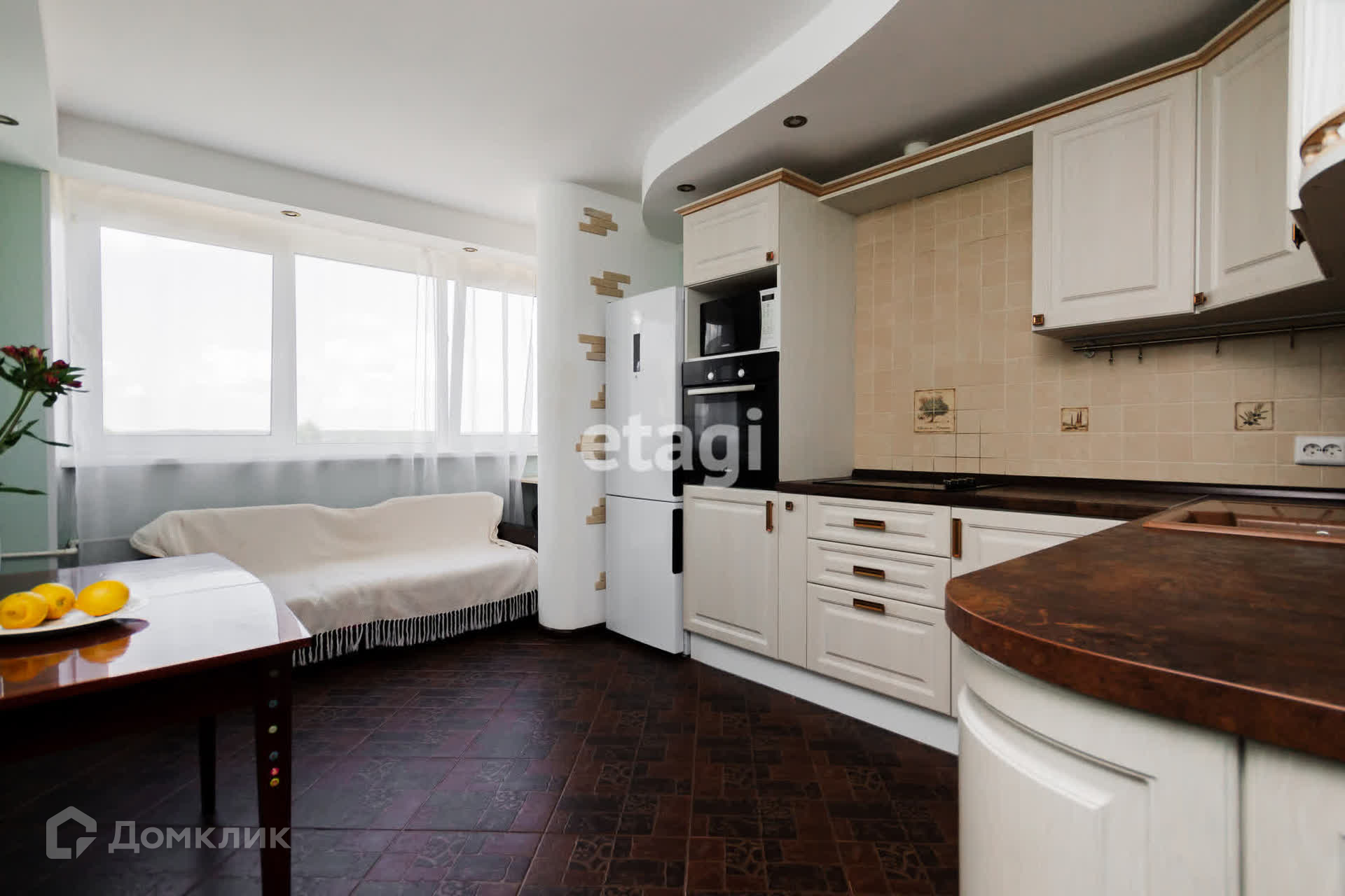 - Просторная лоджия объединена с кухней и утеплена — с заменой окон и теплым полом