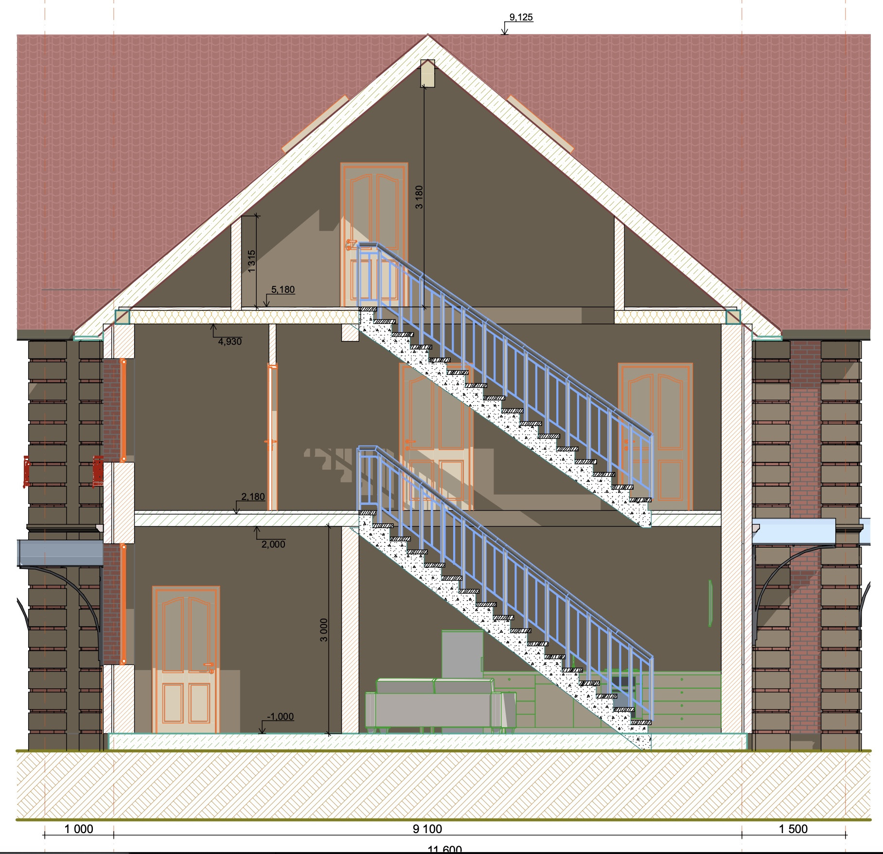 - Внешние стены выполнены из газоблока 300 мм + облицовочный кирпич 65 мм;