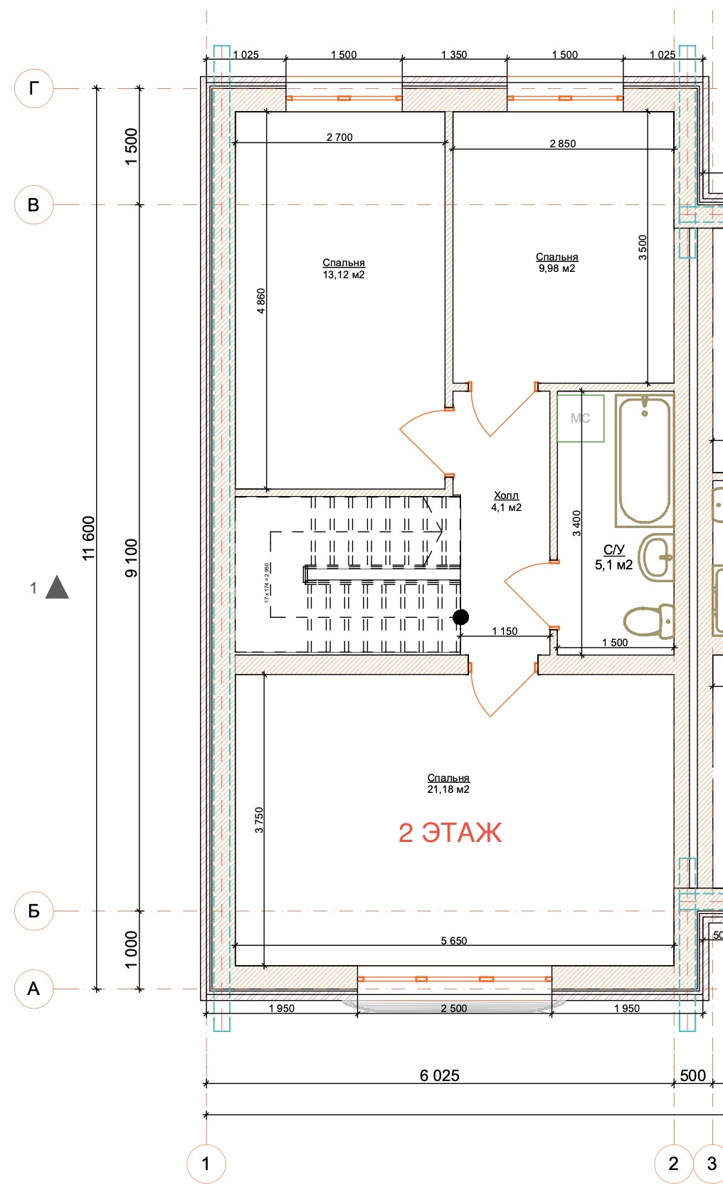 Второй этаж: 3 комнаты, с/у с душевой.
