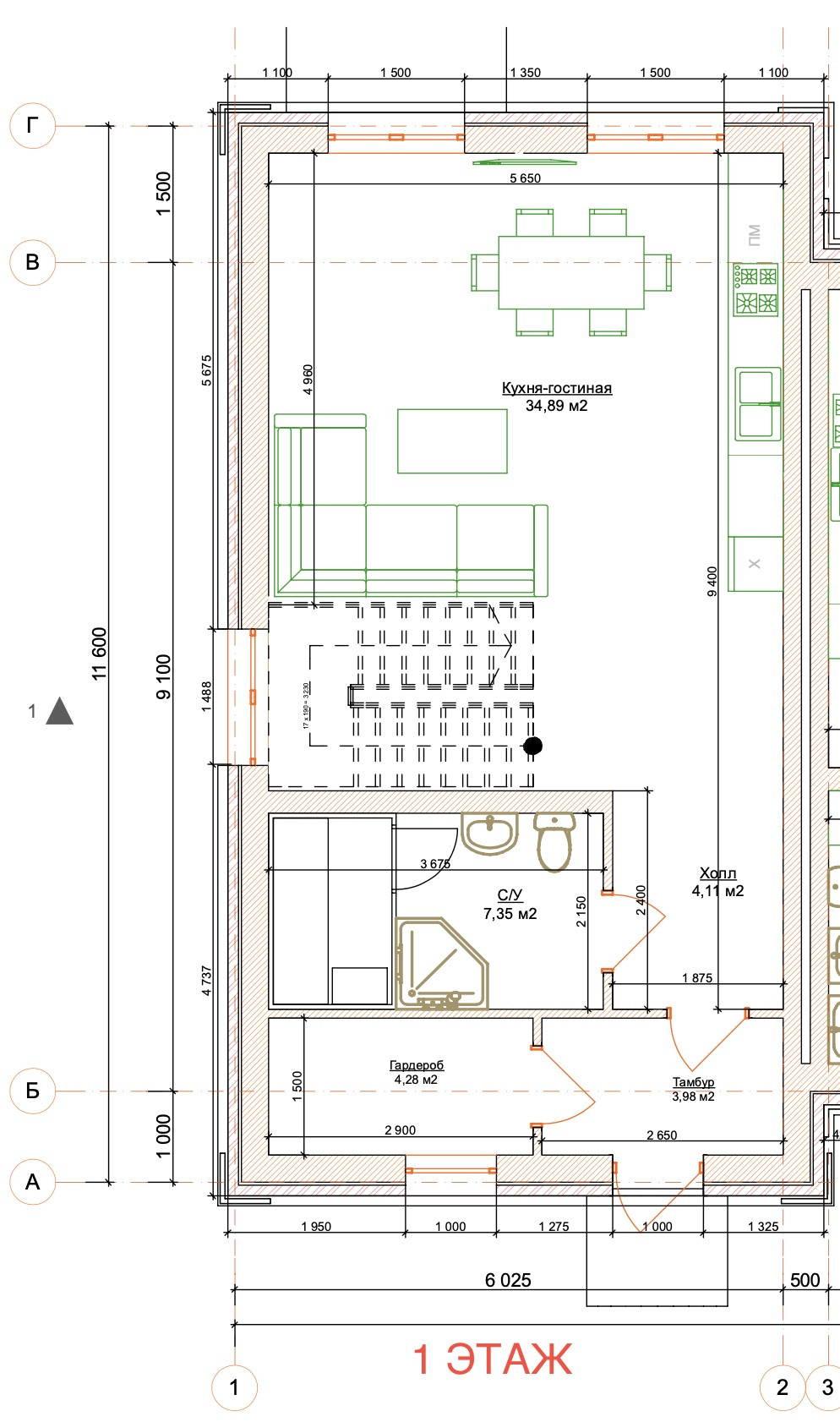Первый этаж: огромная кухня-гостиная, гардеробная зона, просторная ванная с местом под сауну, прихожая, котельная.