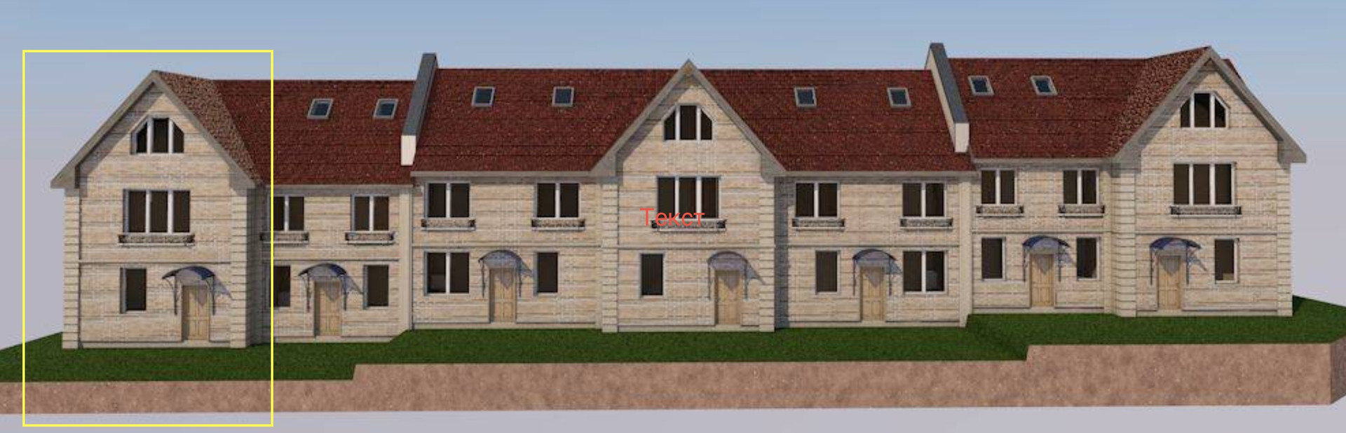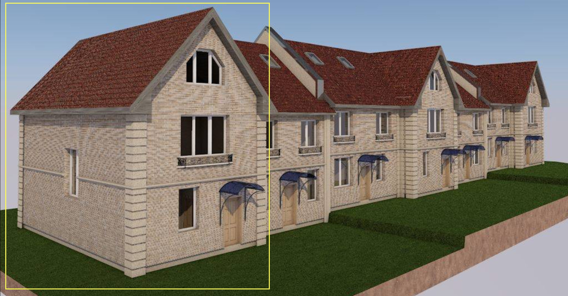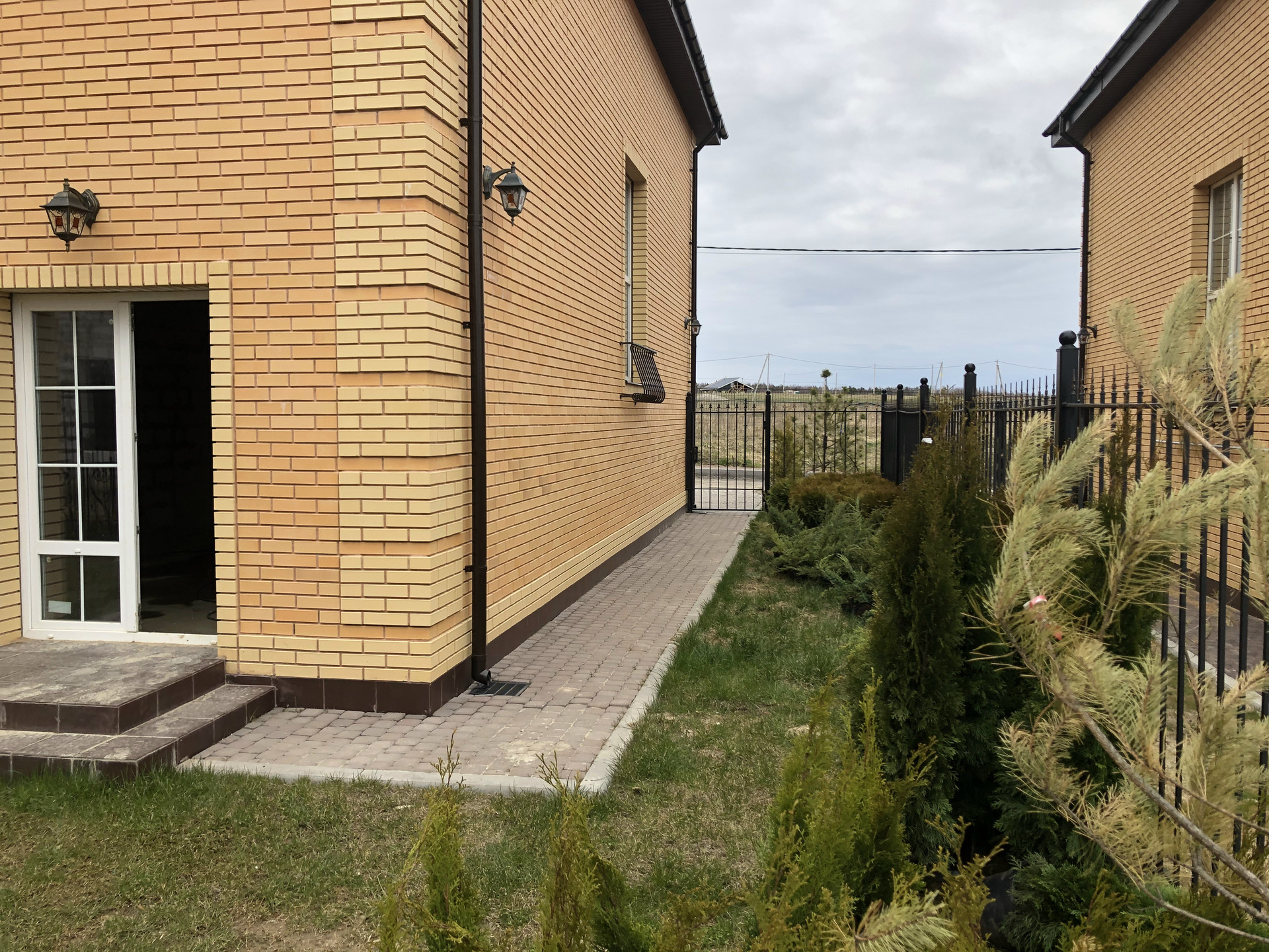 Перед домом парковка на две машины выложена плиткой, на заднем дворе зона барбекю- также - плитка, остальная часть - газон.