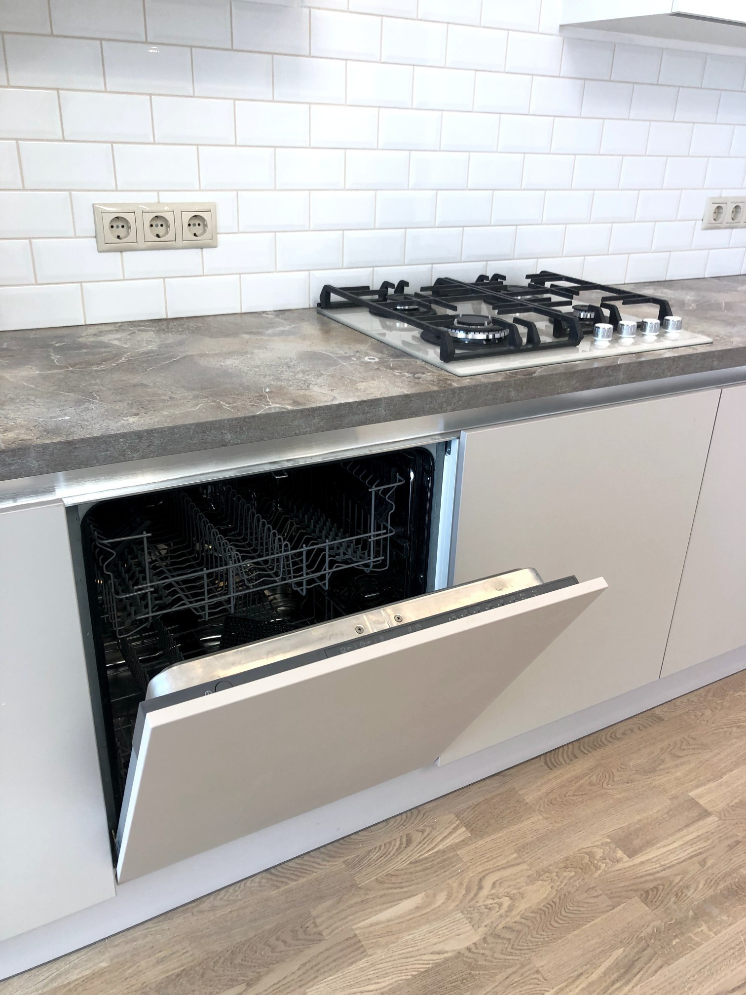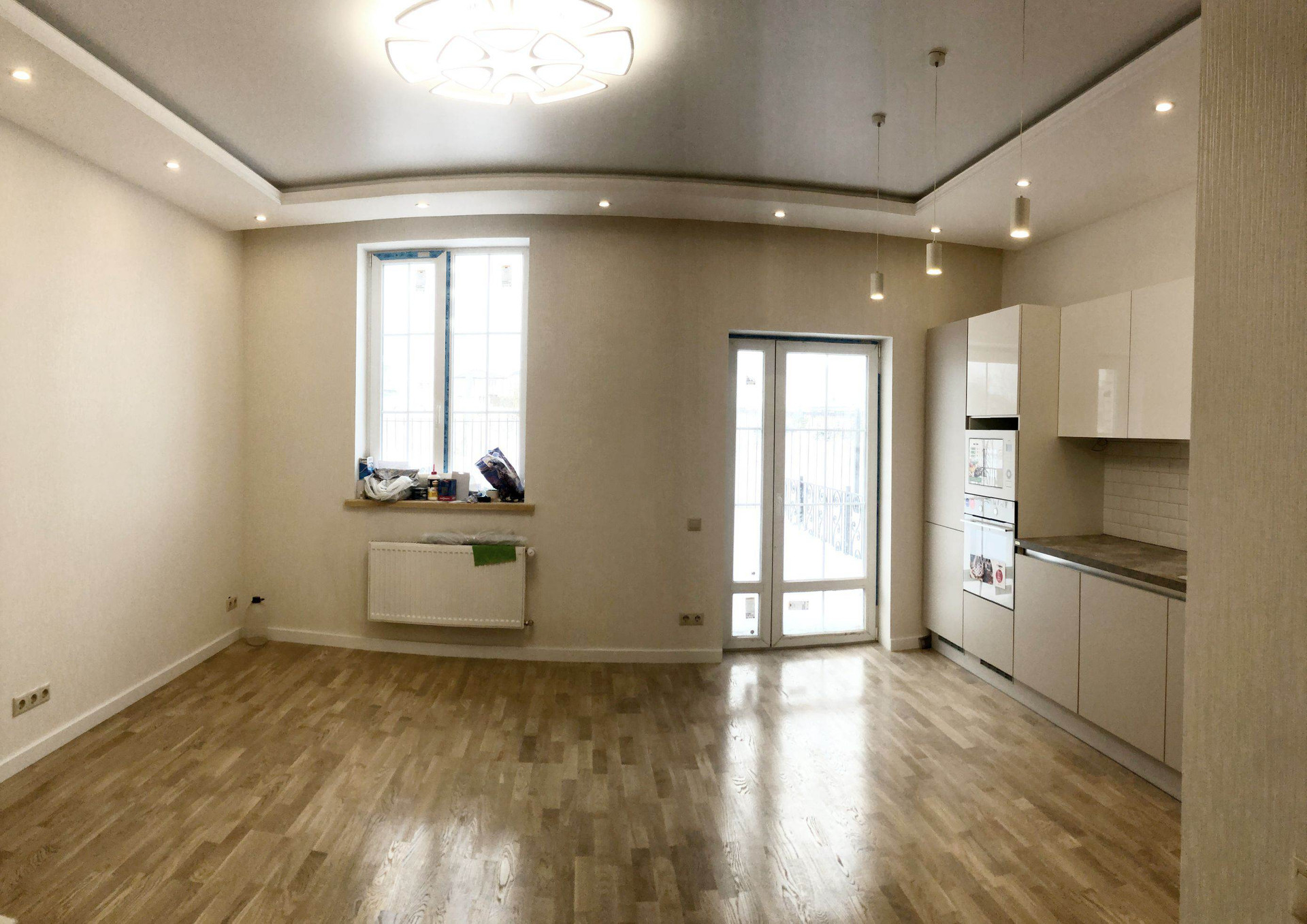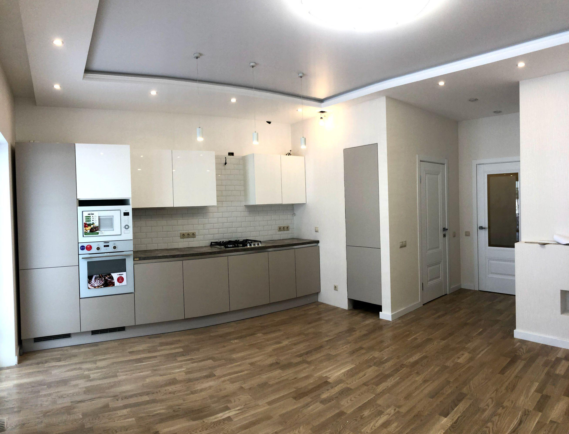 1 этаж: просторная кухня-гостиная 21,5 кв.м. с мебельным кухонным гарнитуром «Мария» и встроенной бытовой техникой (газовая варочная панель, электрический духовой шкаф, встроенная микроволновая печь, посудомоечная машина, встроенный холодильник), гостевой СУС - 2,7 кв.м. с импортной сантехникой, техническое помещение. Теплые водяные полы. Многоуровневый свет.
