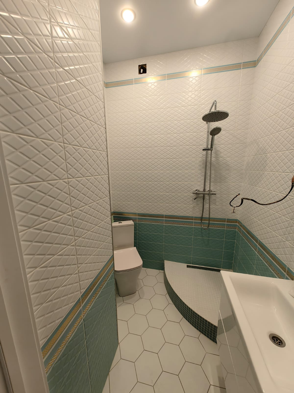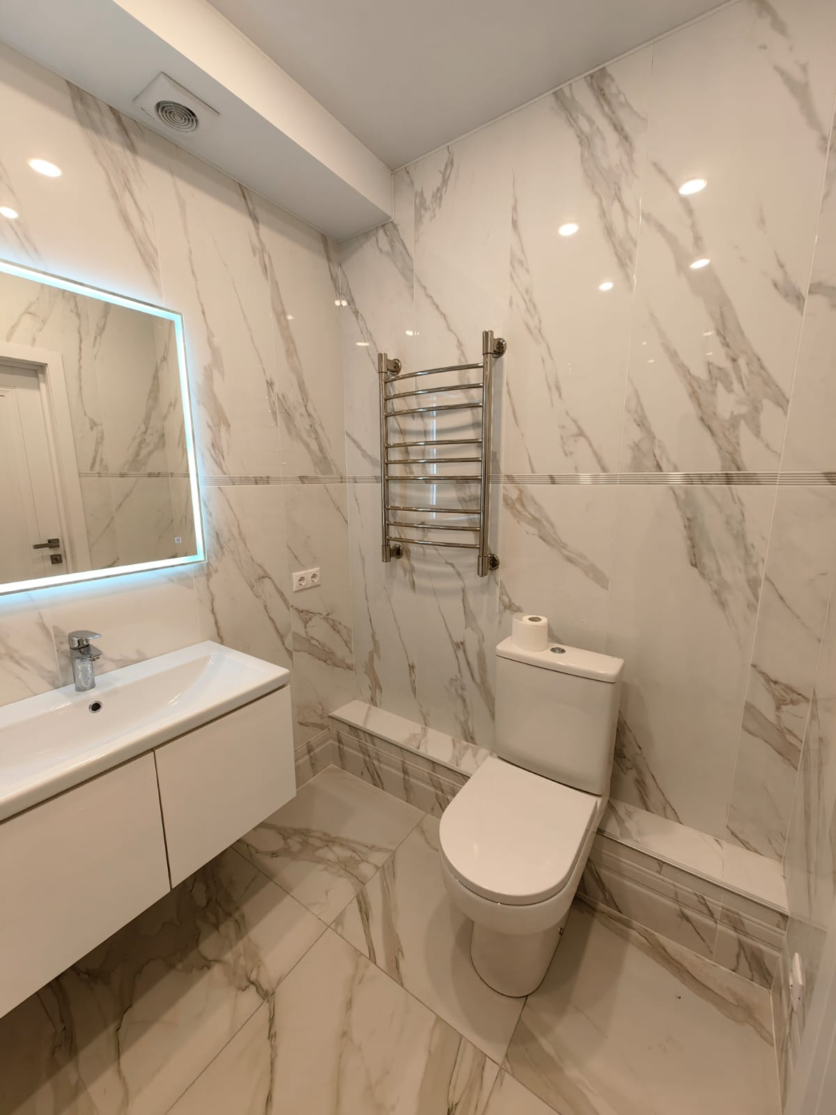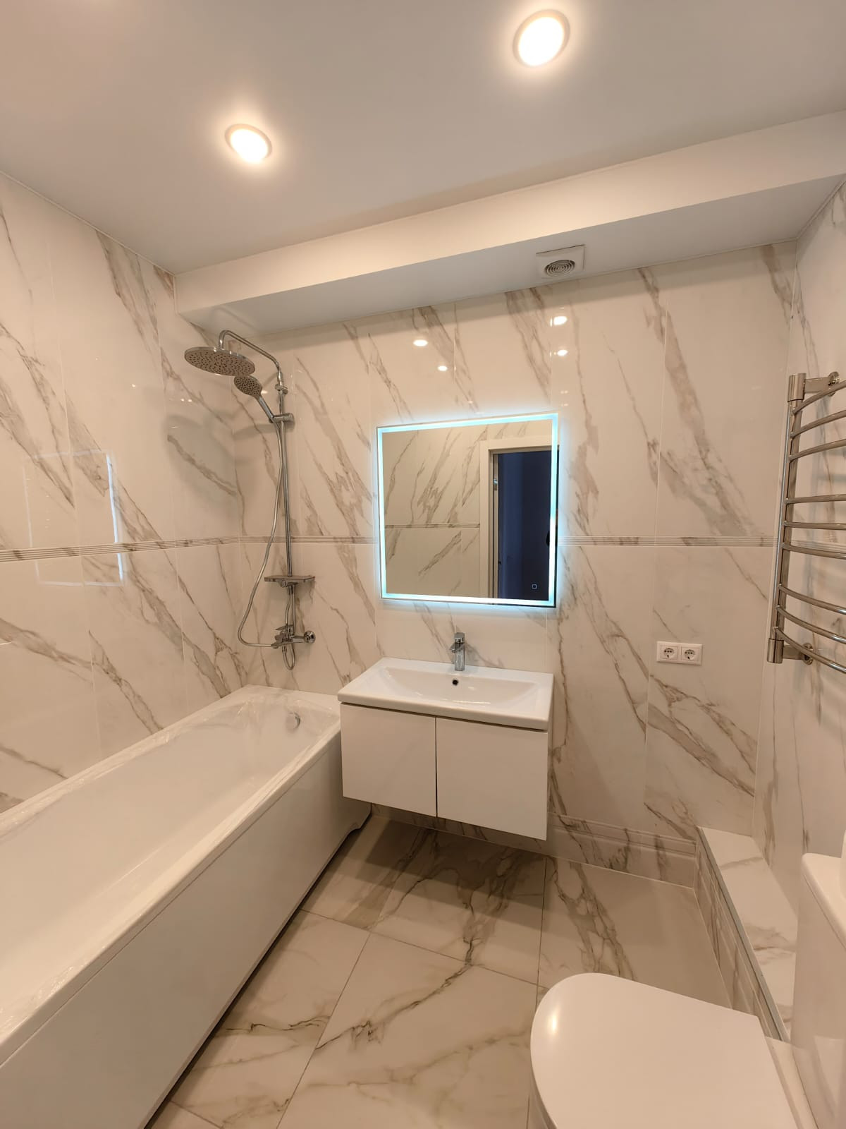 2 этаж: спальня с гардеробной, детская комната, СУС – 4,3 кв.м. с ванной комнатой оснащен импортной сантехникой и смесителями в том числе с душевой системой, также установлено зеркало с подсветкой и навесная тумба.