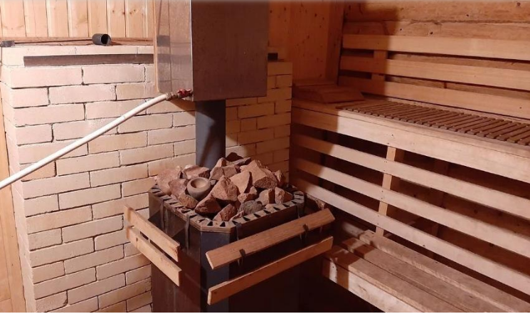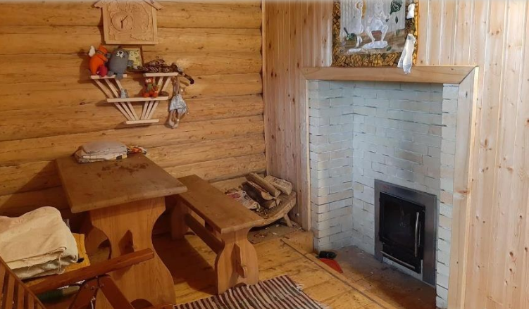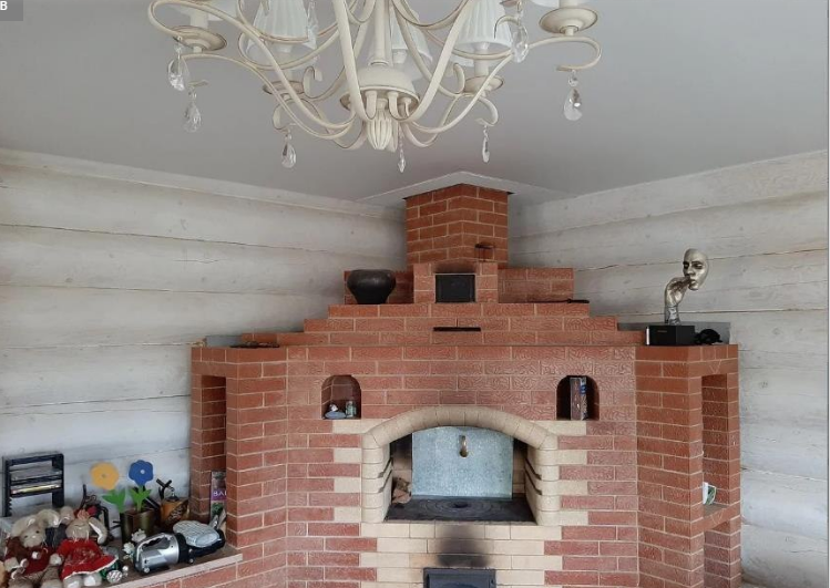 Особенно хочется обратить внимание на русскую печь в гостиной. На ней можно жарить шашлыки, в нее встроен мангал, в ней можно печь пироги, хлеб и всё что угодно. Также она служит камином.