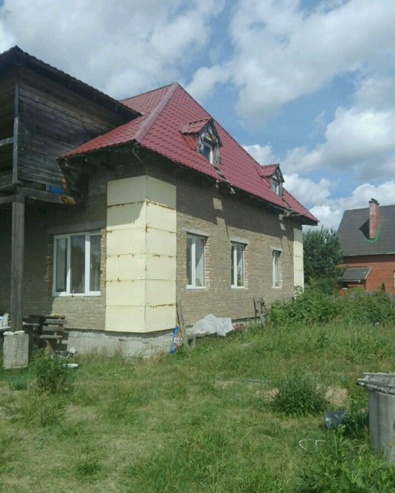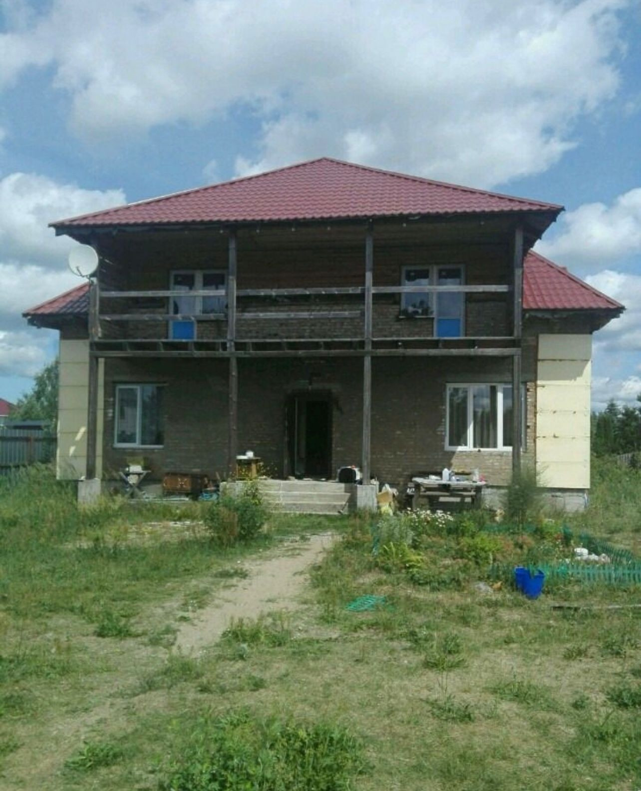 Дом из кирпича на участке в 16 соток, рядом лес. Подключён газ, свет, канализация, скважина.дом очень тёплый. Первый этаж: две спальни, с/у, гостиная совмещённая с кухней, прихожая, бойлер. Второй этаж: 4-е жилые комнаты- 2-е под чистовую отделку, 2-е с отделкой, большой санузел с ванной. Дом требует облицовки и косметики внутри. На участке сруб бани под крышей 6/6, фундамент под гараж, строительная бытовка. Так же на участке имеются плодовые деревья, малина виноград. В доме можно жить и зимой и летом и потихоньку доделывать его под свои цели и дизайн). Всё документы имеются.