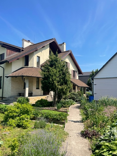 Вокруг дома участок правильной формы площадью 13 соток. На участке бетонированные дорожки, цветники, газон, фруктовые деревья и кустарники, огромная кремлевская ель, колоновидные туи и можжевельник, также огород с плодородной землей. Из дополнительных удобств есть теплица из поликарбоната, вентилируемый ящик для компоста и забор, установленный на фундаменте.