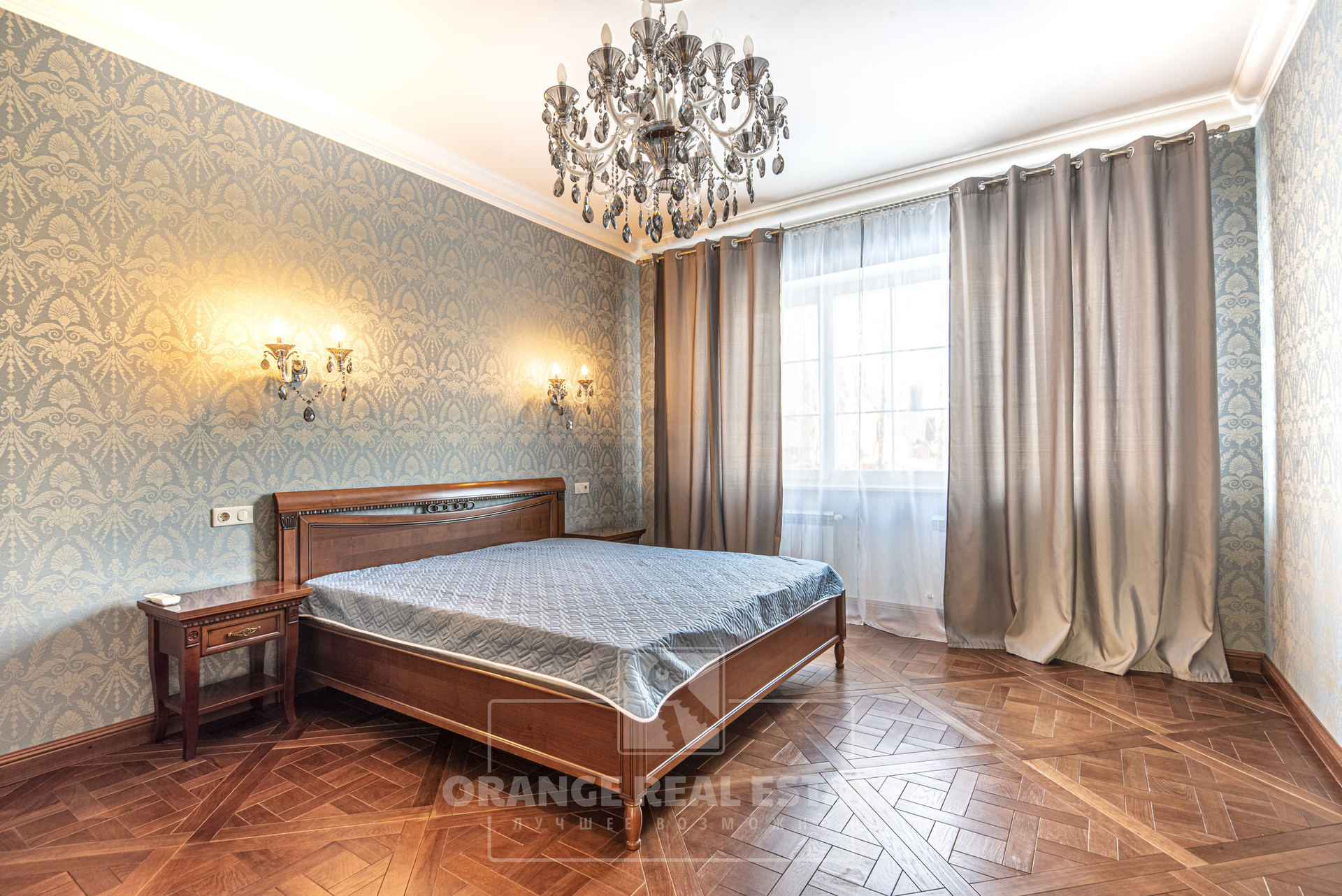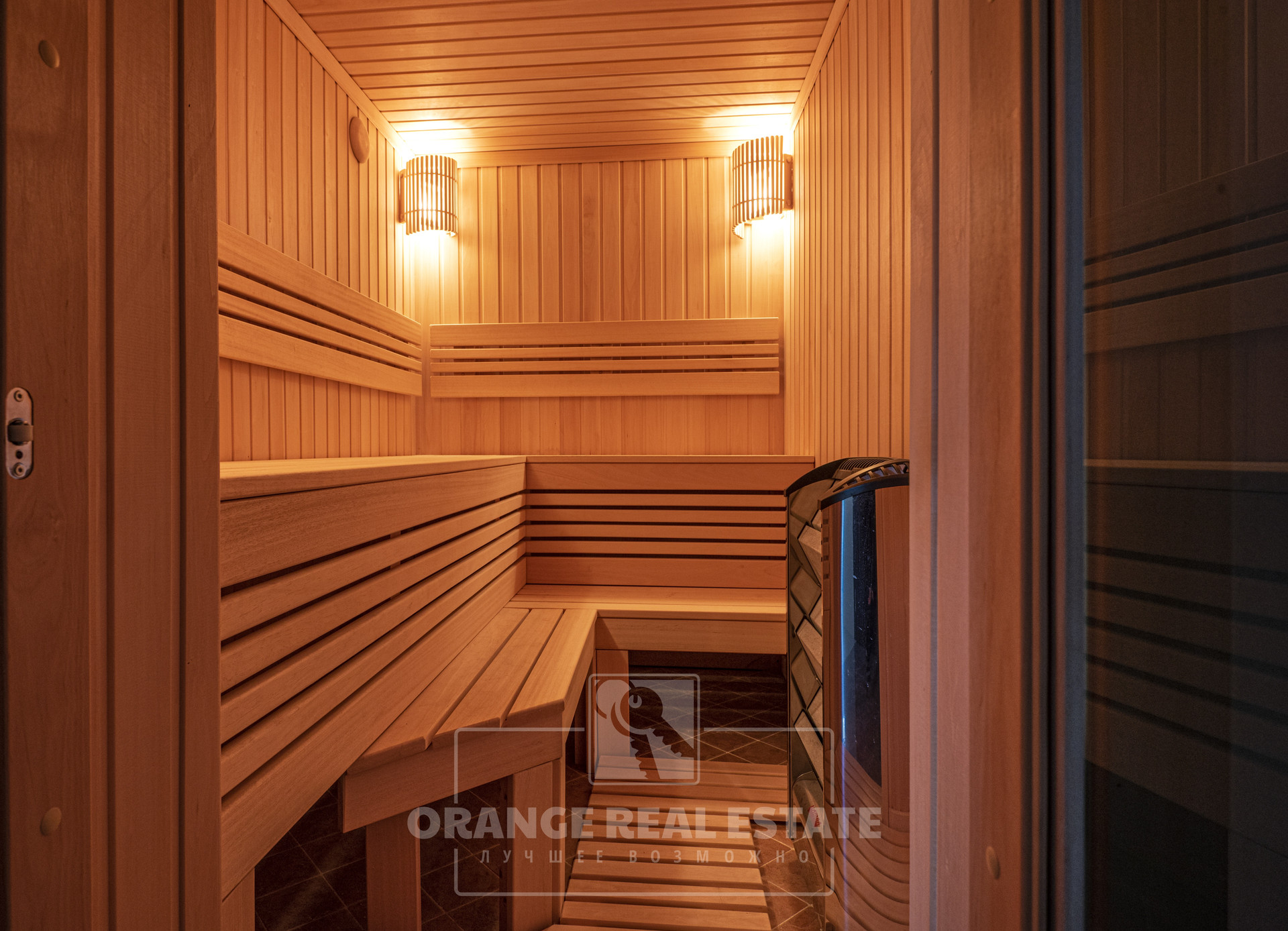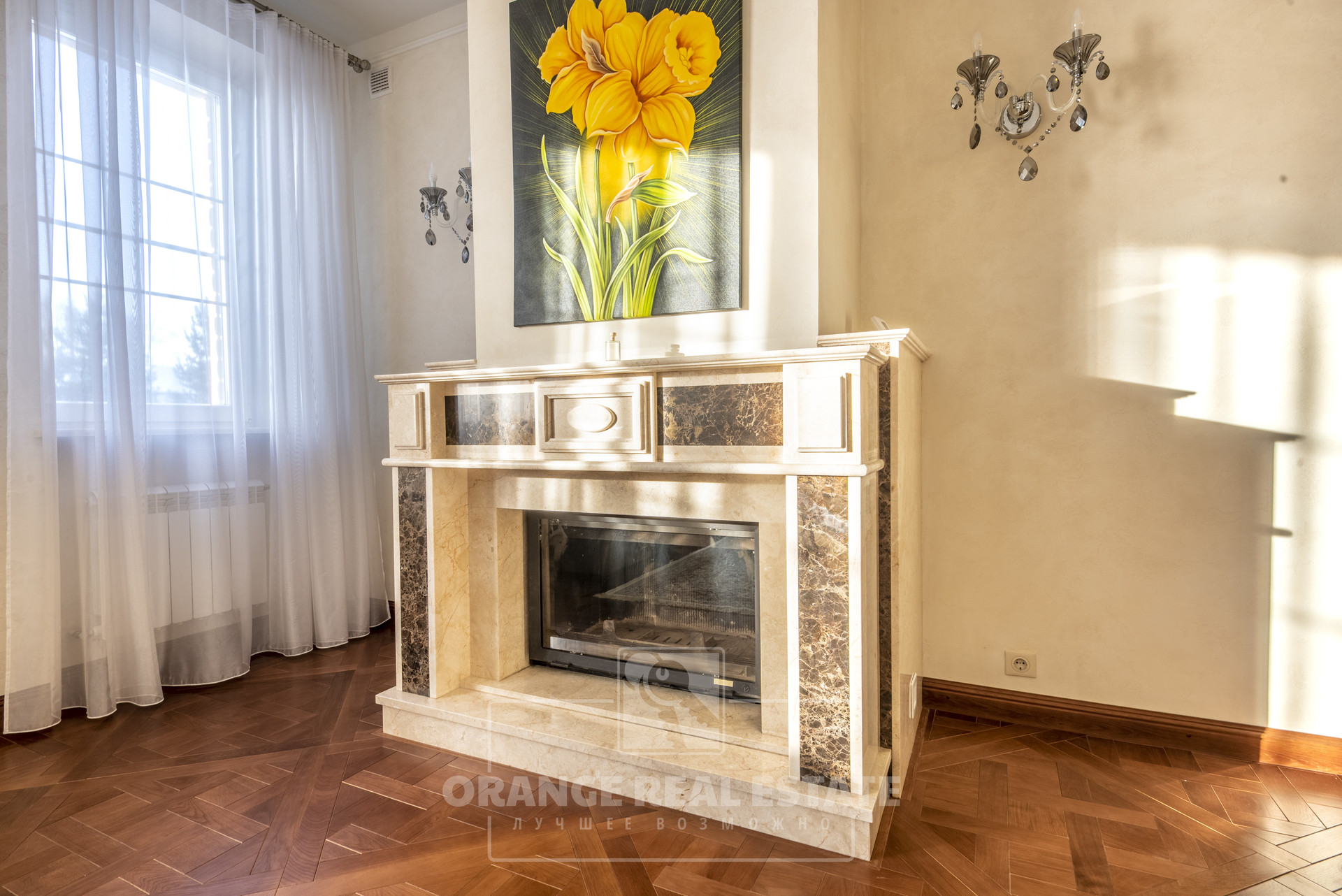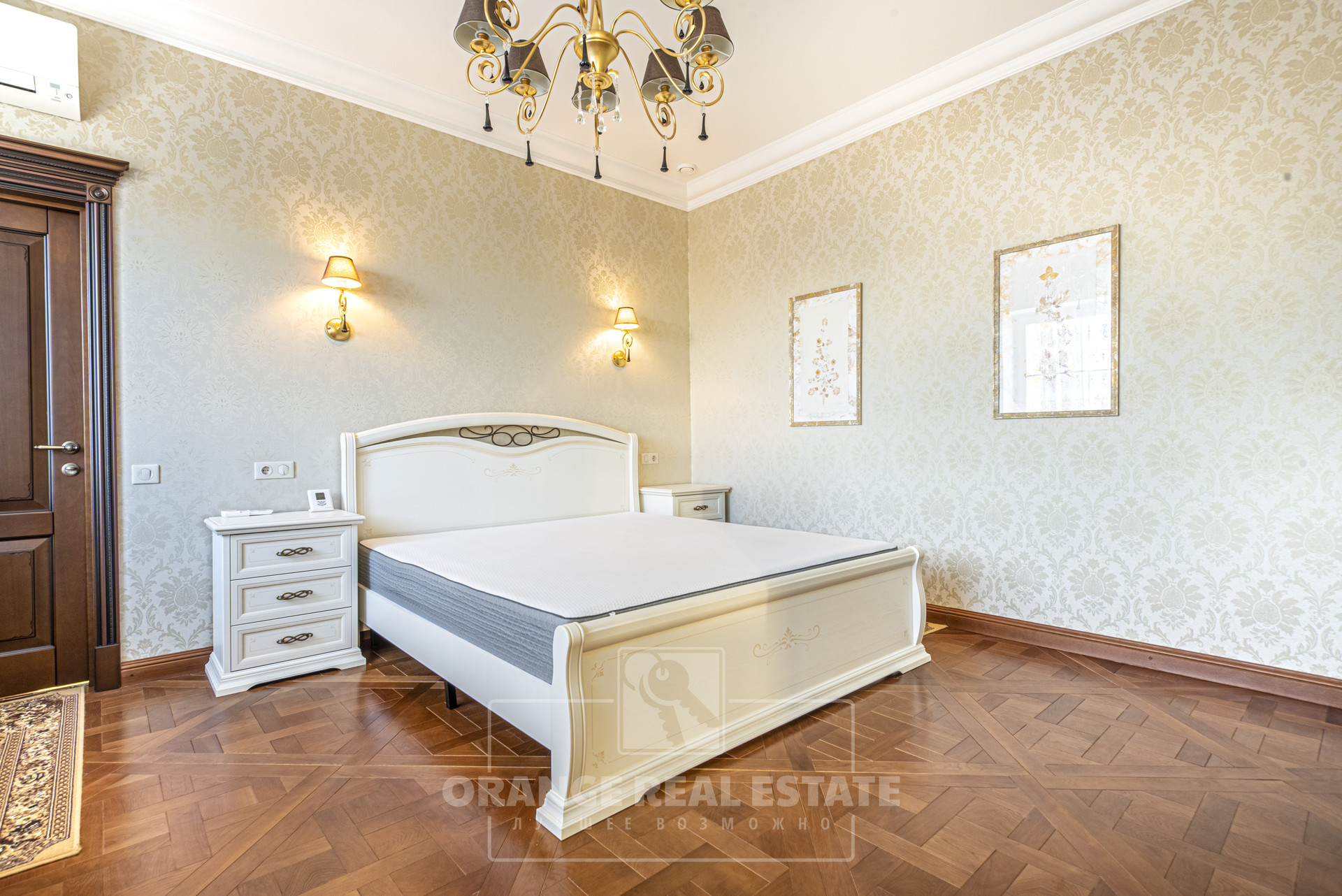 2 этаж - 3 спальни со своими гардеробными и с/у, кабинет, холл. На стенах эксклюзивные шелковые обои, венецианская штукатурка, пол - мрамор и наборный паркет. Панорамное остекление, витражи.