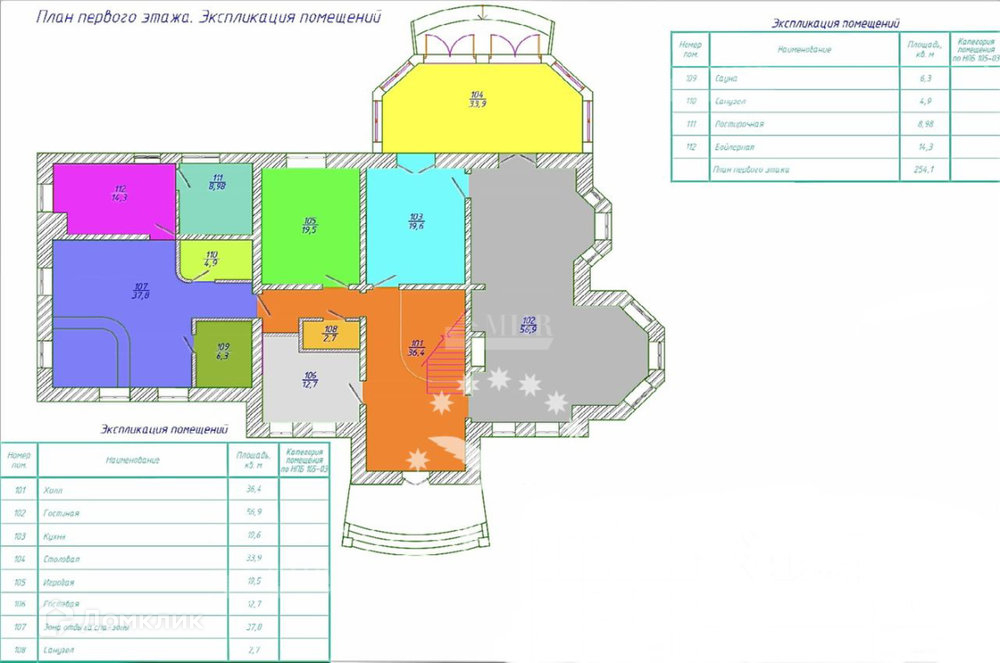 1 этаж: холл, гостиная с каминным залом и зоной ТВ, кухня, столовая, гостевая спальня, игровая комната (гостевая спальня), гостевой с/у, зона спа (сауна, комната отдыха со спа-бассейном, с/у), котельная, постирочная.