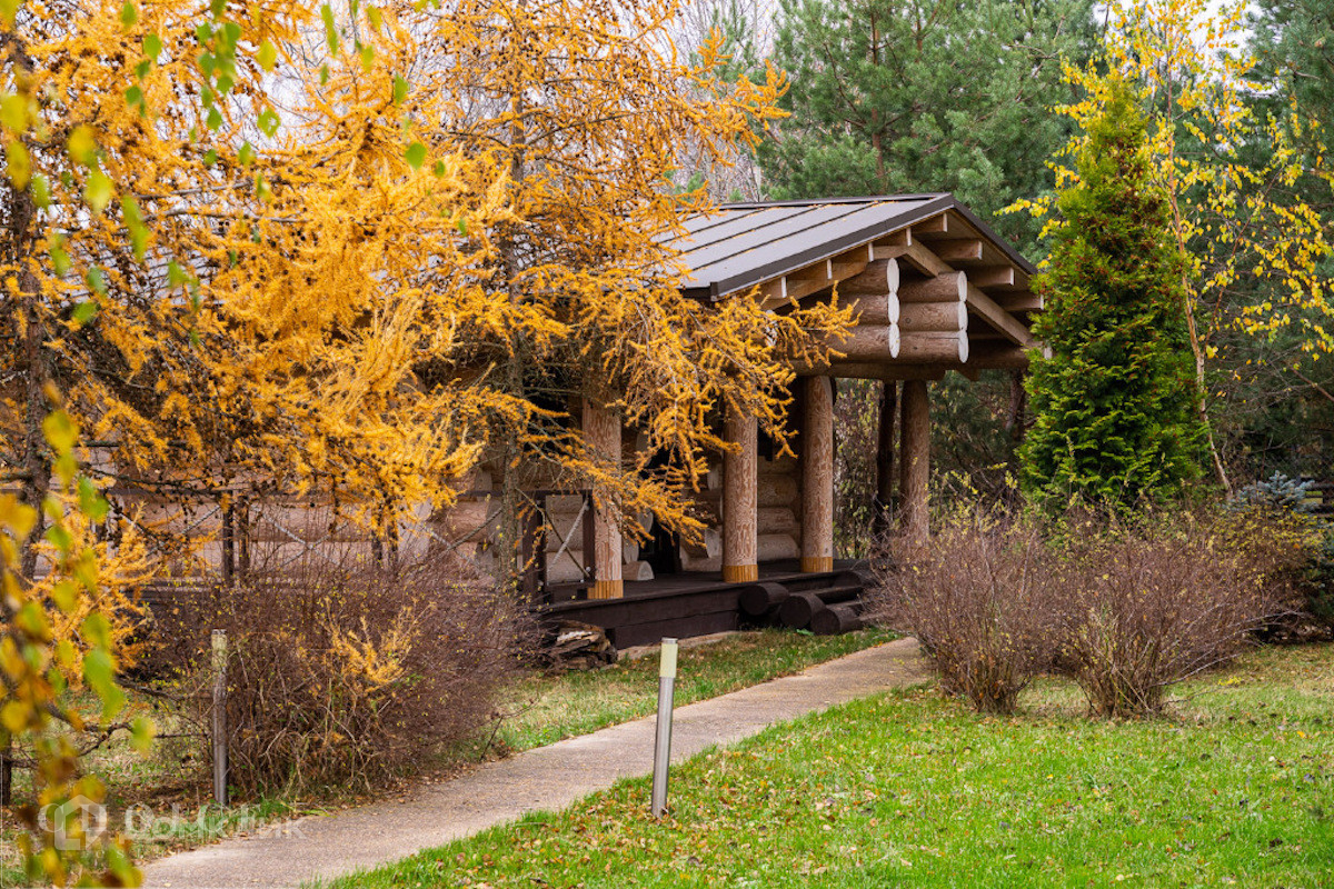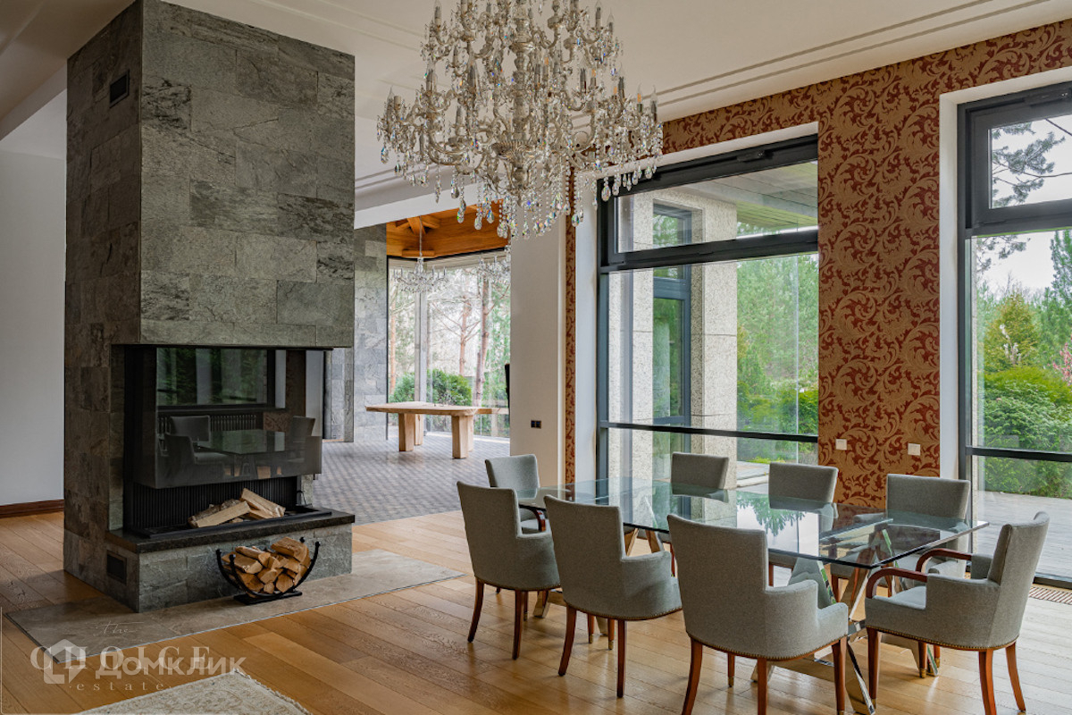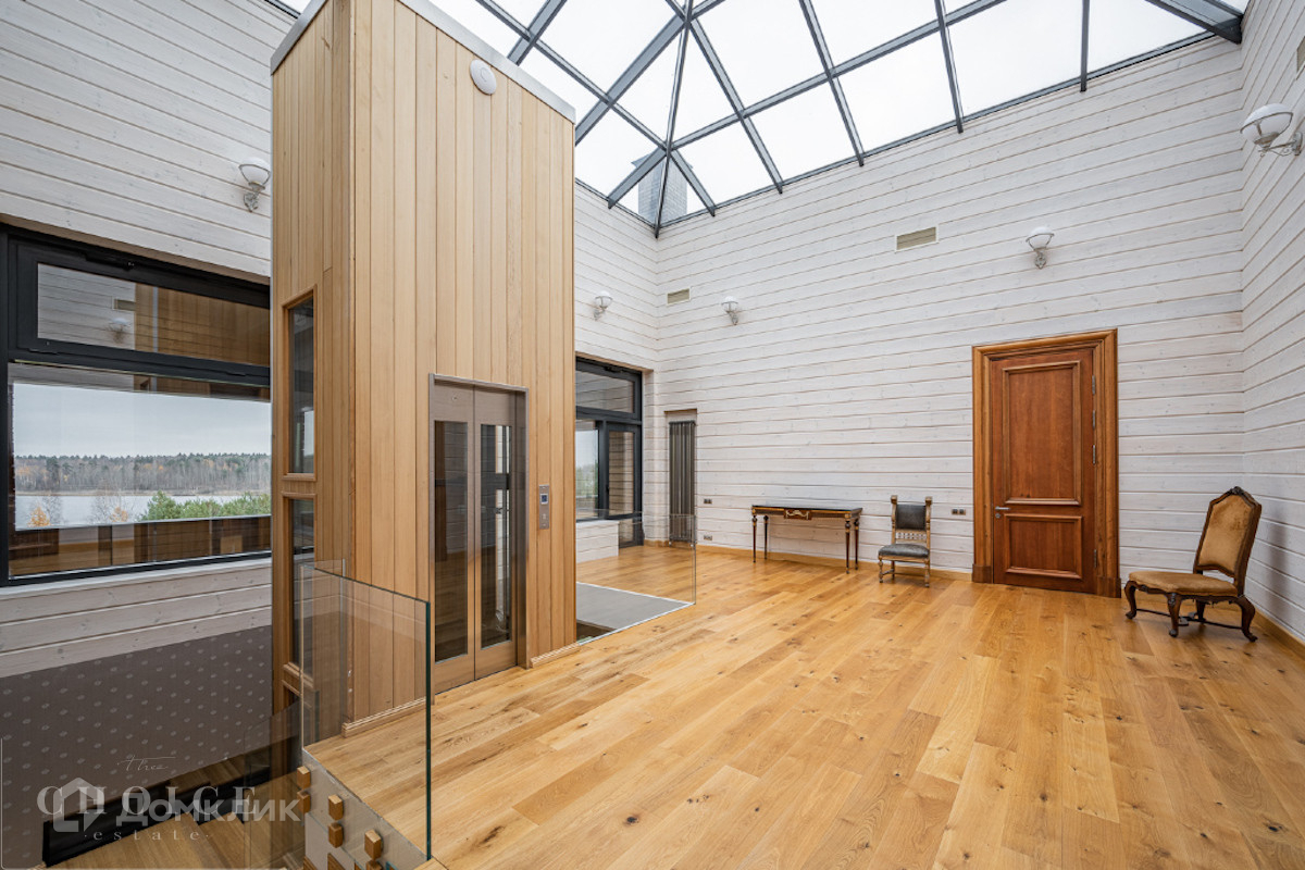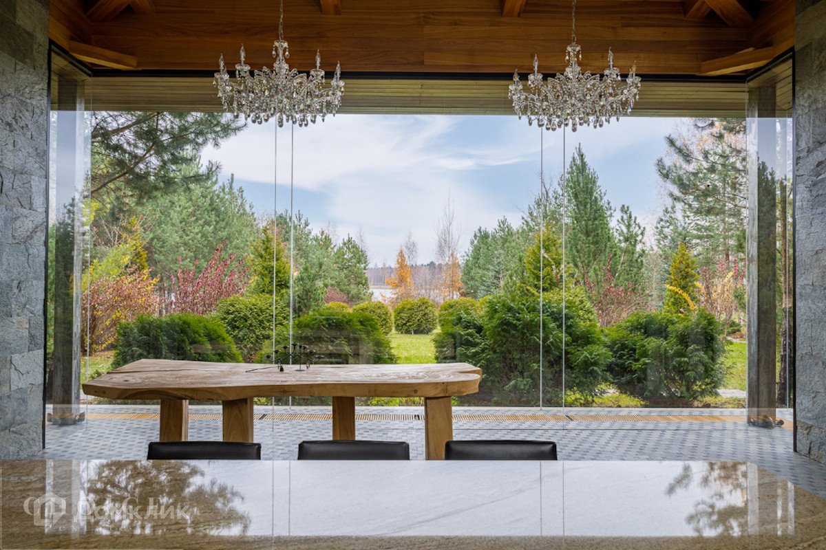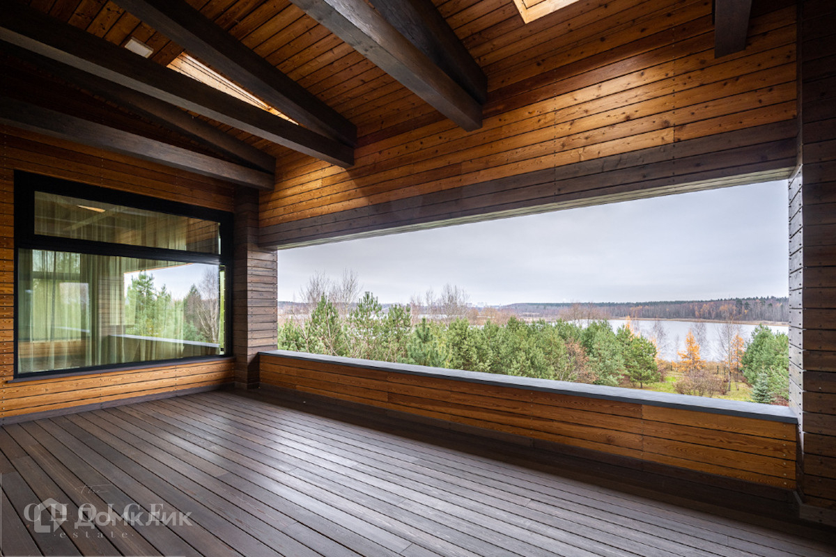 Современный дом с большими панорамными окнами, балконами необычной архитектурной формы, оригинальной по форме крышей, с канадским кедром и дорогим камнем во внешней отделке очень гармонично вписан в ландшафт участка. Внутренние интерьеры, выполненные в современном стиле поражают своим комфортом, продуманностью планировки, обилием пространства и света. Изюминкой дома несомненно является камин-очаг, множество зеркал, выполненных в едином стиле, лестница со стеклянными перилами. На участке есть отдельно стоящий гараж (329 кв .м.) с квартирой для персонала : 2 спальни, 2 кухня, 2 с/у. Выполнены все ландшафтные работы. Здесь растут раскидистые ели, молодые каштаны, липы, туи, необыкновенной красоты декоративные кустарники. Имеется собственный выход к красивому природному озеру.