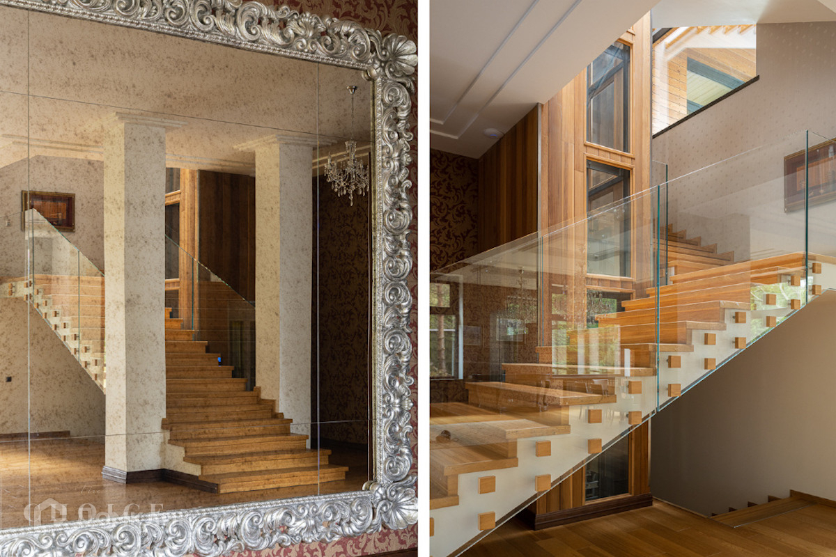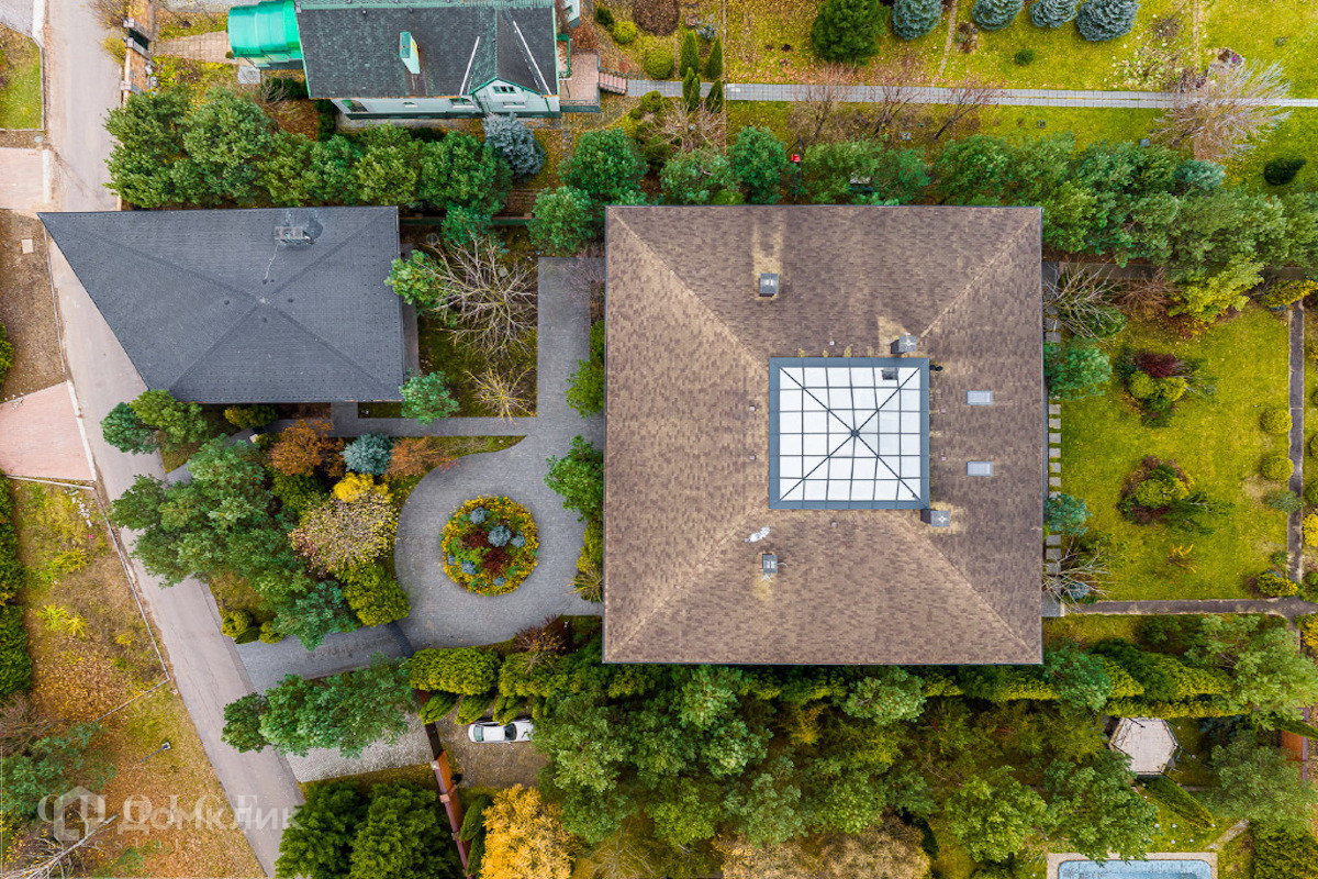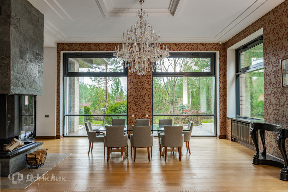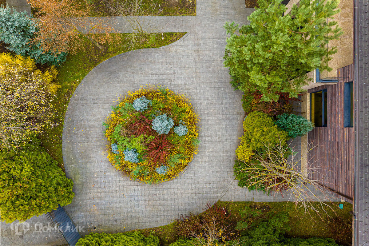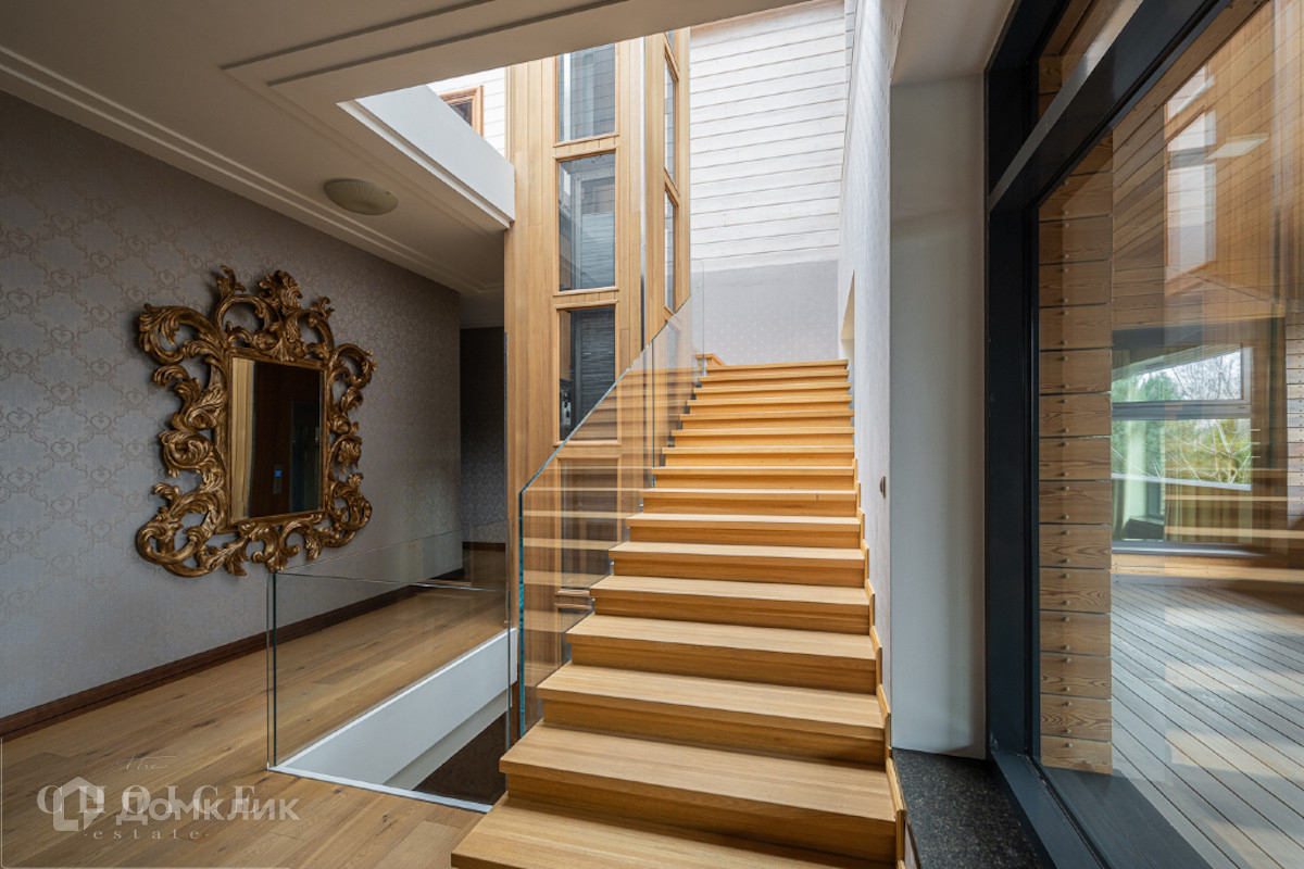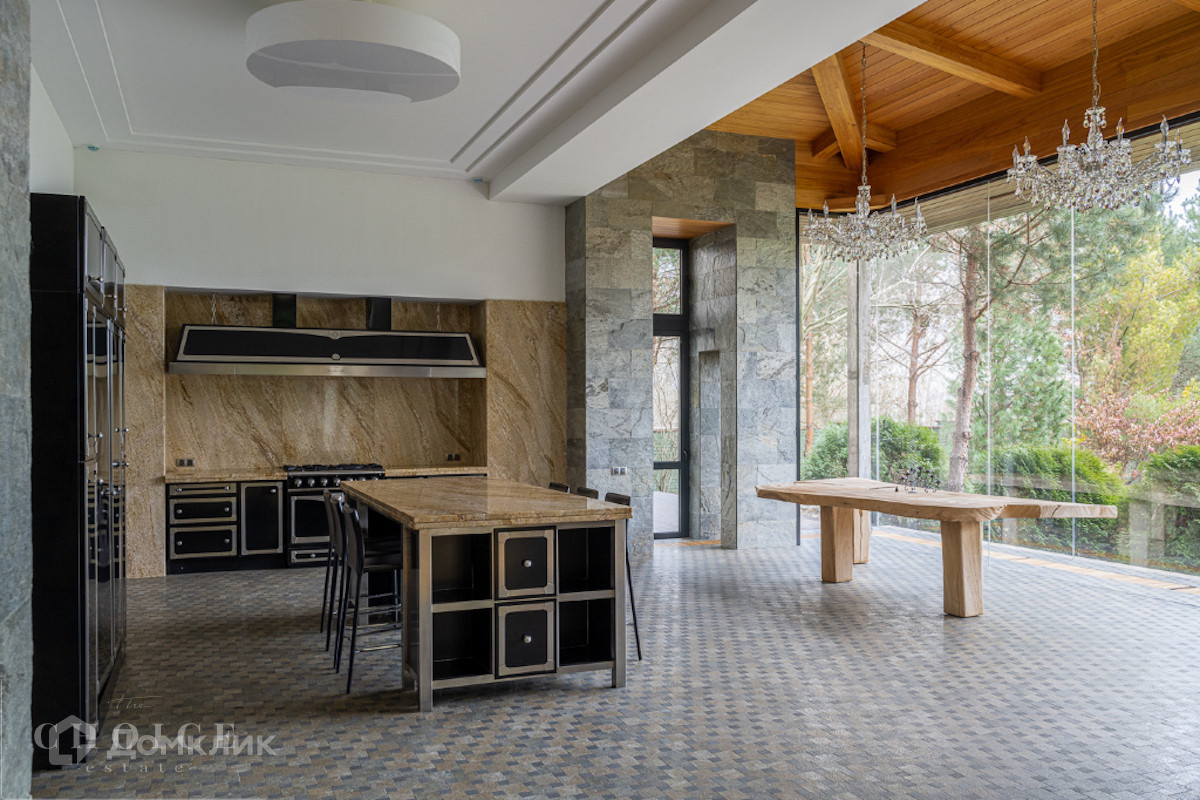 Современный дом с большими панорамными окнами, балконами необычной архитектурной формы, оригинальной по форме крышей, с канадским кедром и дорогим камнем во внешней отделке очень гармонично вписан в ландшафт участка. Внутренние интерьеры, выполненные в современном стиле поражают своим комфортом, продуманностью планировки, обилием пространства и света. Изюминкой дома несомненно является камин-очаг, множество зеркал, выполненных в едином стиле, лестница со стеклянными перилами. На участке есть отдельно стоящий гараж (329 кв .м.) с квартирой для персонала : 2 спальни, 2 кухня, 2 с/у. Выполнены все ландшафтные работы. Здесь растут раскидистые ели, молодые каштаны, липы, туи, необыкновенной красоты декоративные кустарники. Имеется собственный выход к красивому природному озеру.