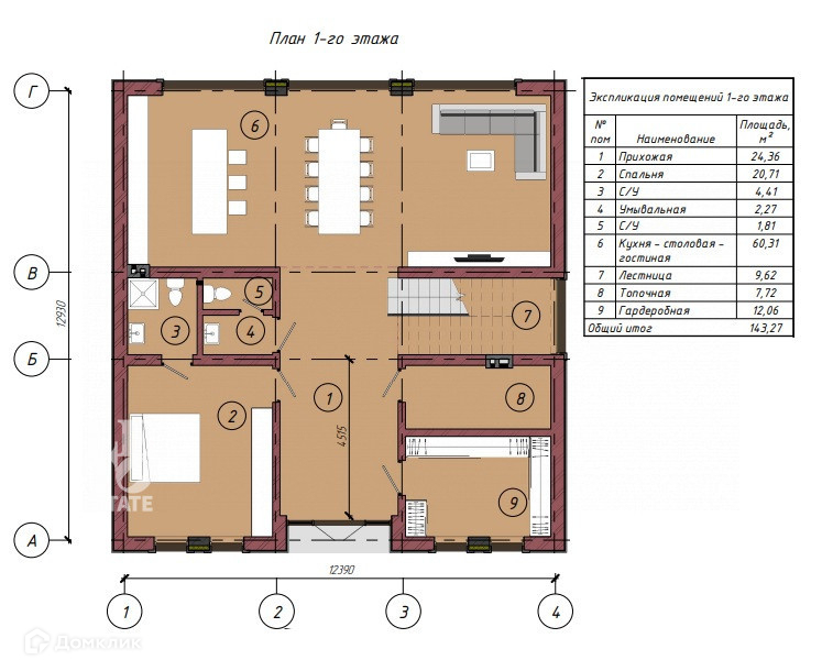 Первый этаж: прихожая, кухня-гостиная, гардеробная, санузел, спальня с санузлом с душевой