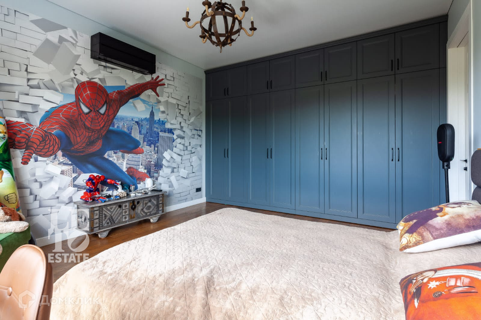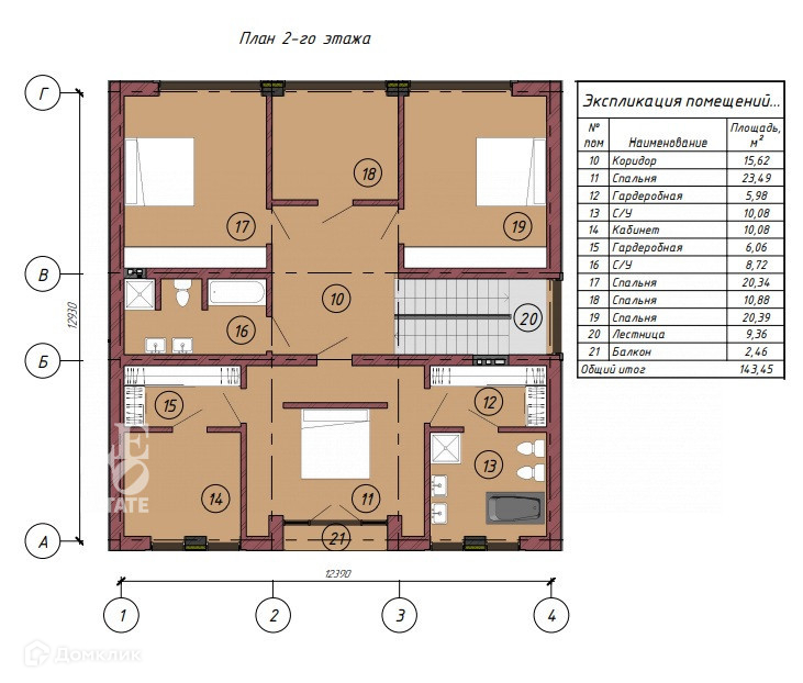 Второй этаж: коридор, детская комната, санузел, мастер-спальня с двумя гардеробными и санузлом с ванной и кабинетом, детская комната, спальня
