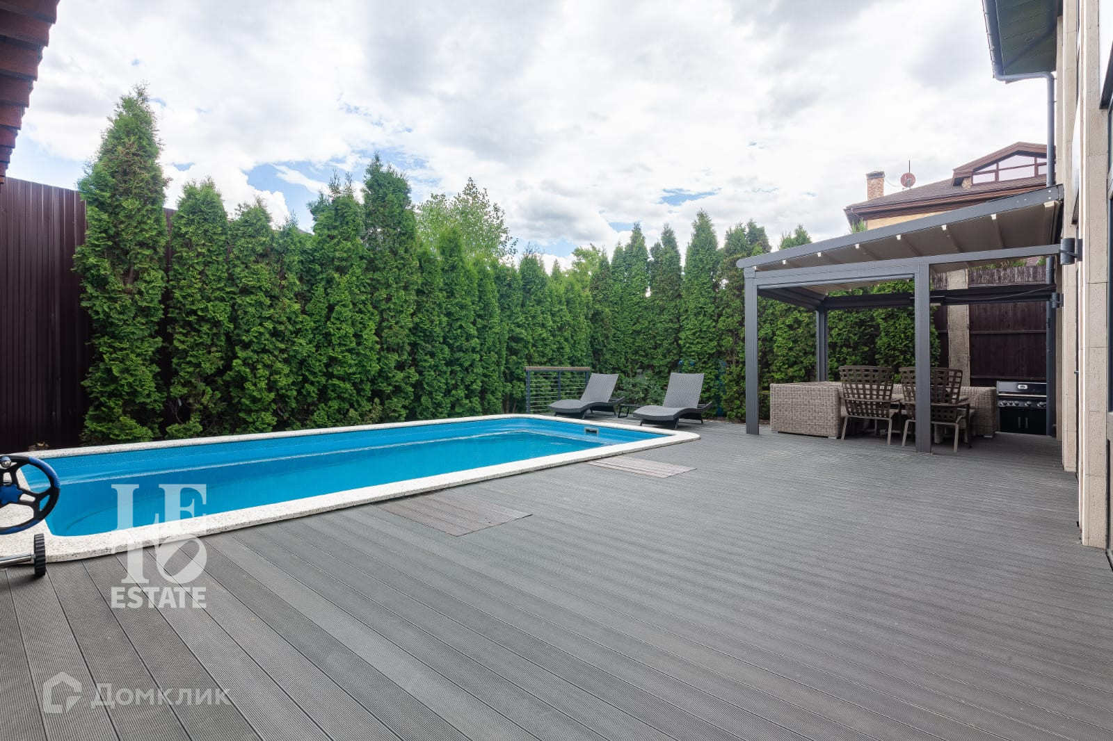 На ровном участке правильной формы выполнен засеян газон, сделаны дорожки, установлено освещение. Территория участка огорожена металлическим забором, въездные ворота оснащены электроприводом. На территории участка расположена небольшая баня и открытый бассейн, перед которым сделана площадка для комфортного отдыха возле воды.