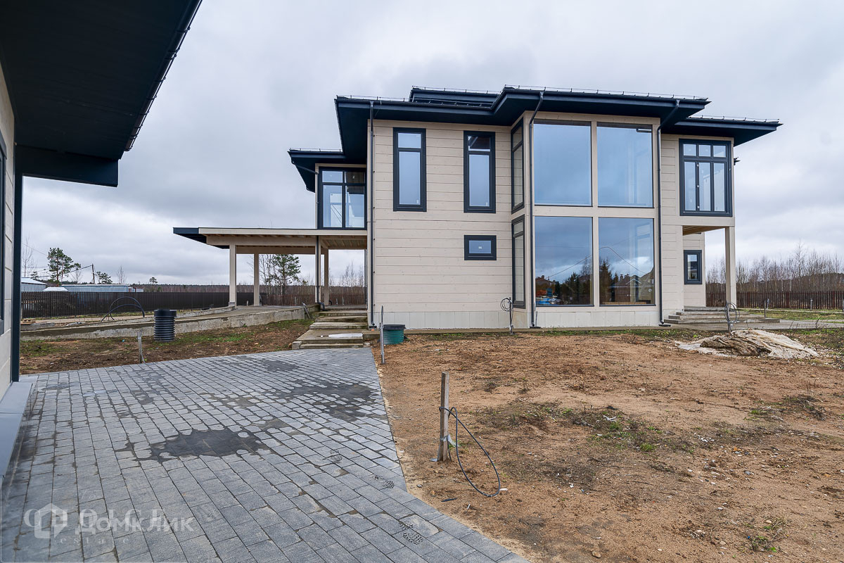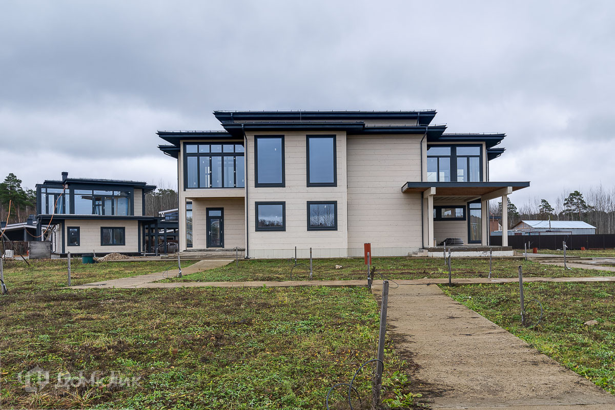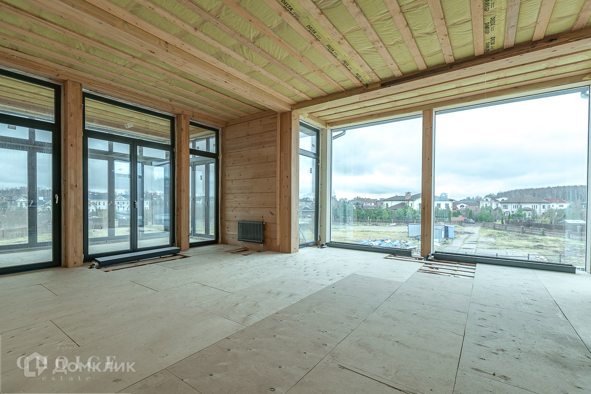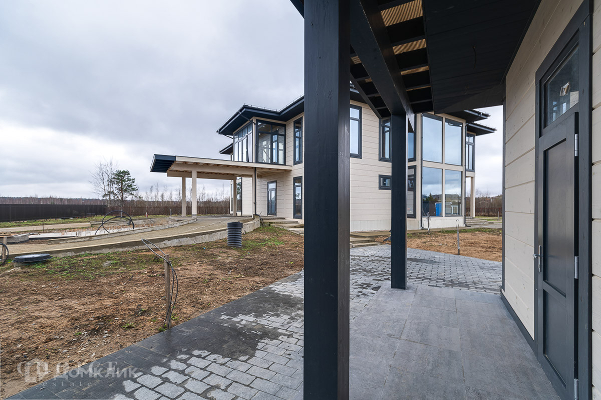 Загородный коттедж площадью 654,5кв.м  расположен на просторном полевом участке 40 соток. Фасад дома с большой площадью остекления, построенный по технологии Post and Beam, выполнен из клеёного бруса. В резиденции без отделки можно реализовать индивидуальный дизайн-проект. В коттедже спланировали 3 спальни, гостиную со вторым светом, кухню-столовую и сауну с комнатой отдыха. На территории построен гостевой дом с гаражом на 2 машины и навесом площадью 450 м², в котором предусмотрены 2 спальни, террасы, кухня-столовая, спортзал, комната отдыха для водителя с санузлом, холодная кладовая. На участке можно выполнить ландшафтный дизайн и обустроить беседку с зоной барбекю.