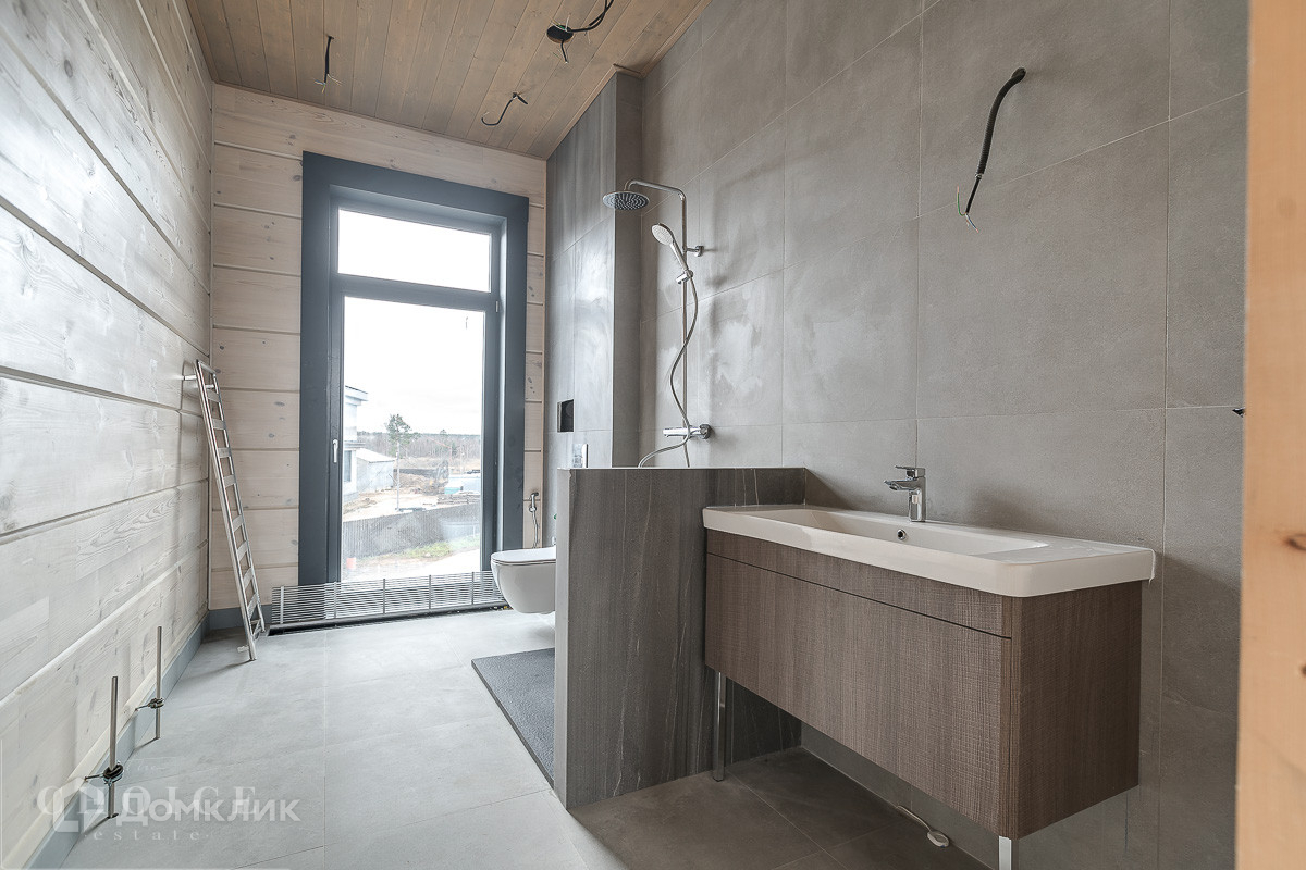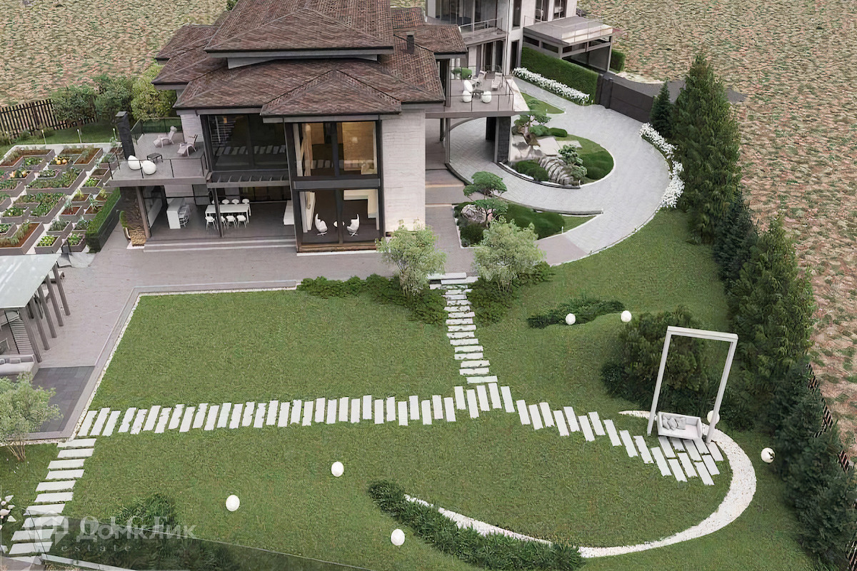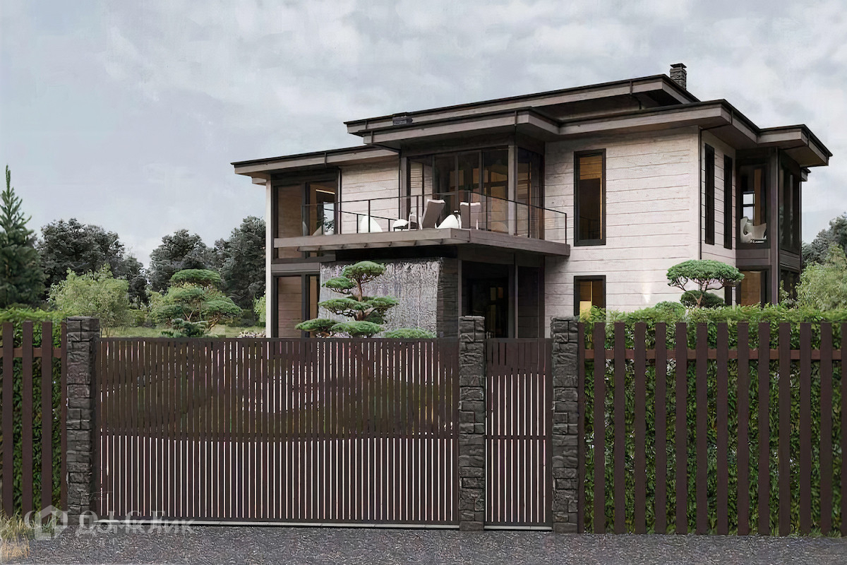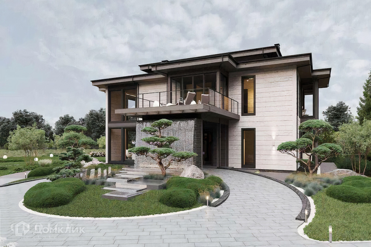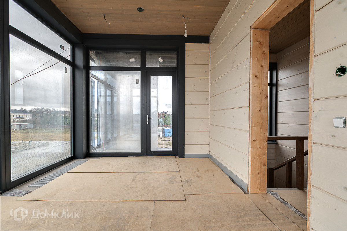 Загородный коттедж площадью 654,5кв.м  расположен на просторном полевом участке 40 соток. Фасад дома с большой площадью остекления, построенный по технологии Post and Beam, выполнен из клеёного бруса. В резиденции без отделки можно реализовать индивидуальный дизайн-проект. В коттедже спланировали 3 спальни, гостиную со вторым светом, кухню-столовую и сауну с комнатой отдыха. На территории построен гостевой дом с гаражом на 2 машины и навесом площадью 450 м², в котором предусмотрены 2 спальни, террасы, кухня-столовая, спортзал, комната отдыха для водителя с санузлом, холодная кладовая. На участке можно выполнить ландшафтный дизайн и обустроить беседку с зоной барбекю.