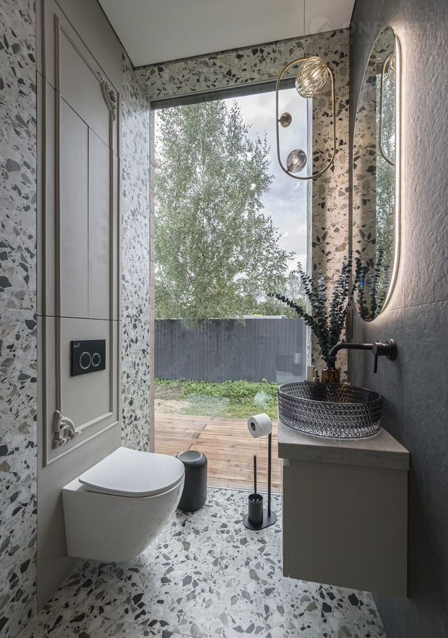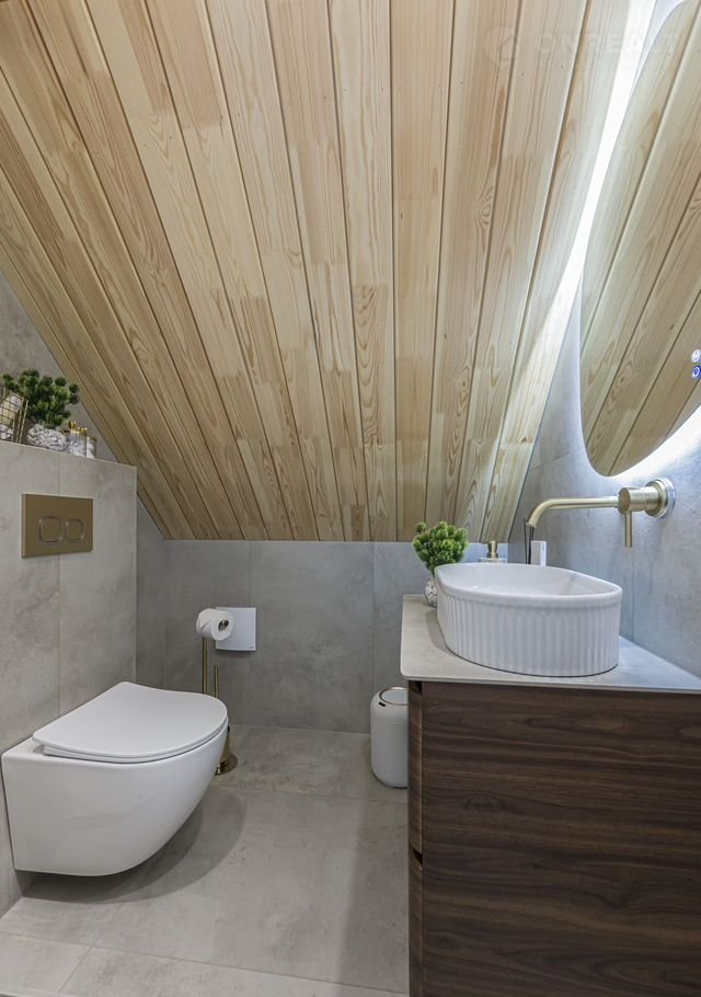 В отделке санузлов использован крупноформатный керамогранит, душевые системы и смесители скрытого монтажа, стильные навесные тумбы и дизайнерские накладные раковины, вертикальные полотенцесушители. Напольное покрытие: первый этаж - крупноформатный керамогранит, второй этаж - премиальный ламинат, повторяющий фактуру и цвет натурального дерева. Стены окрашены, использованы молдинги, декоративные панели. Лестница широкая, с удобным шагом, каркас выполнен из металла, ступени - дерево (покрыты лаком). Межкомнатные двери с алюминиевой кромкой.