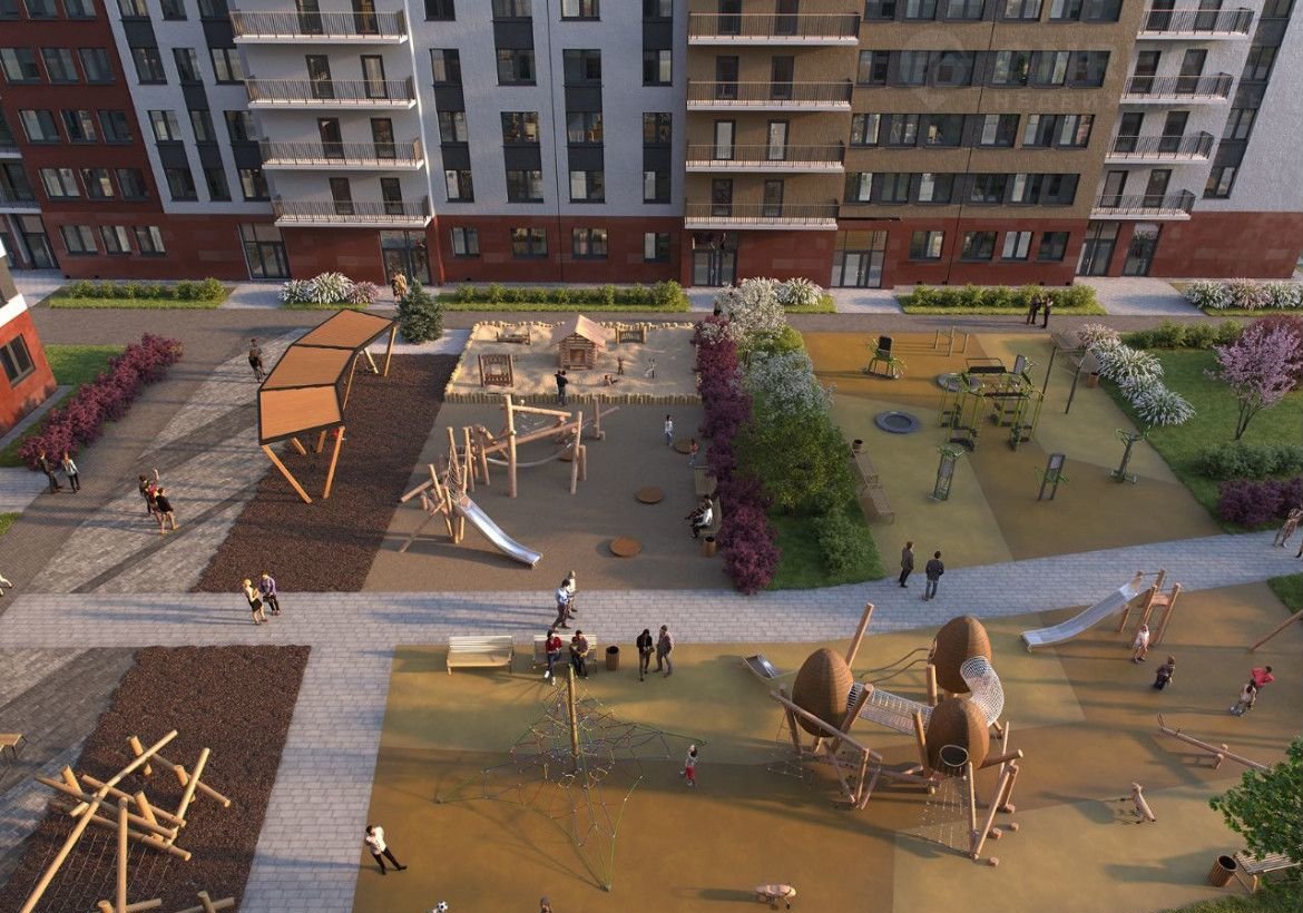 Вестибюли облицуют керамогранитом, в парадных запланированы помещения для хранения колясок и велосипедов. Для машин предусмотрены два теплых, охраняемых подземных паркинга. Дворы комплекса будут пешеходными с детскими площадками со сквозными проходами подъездов..