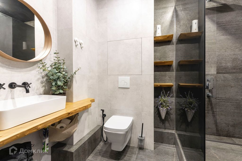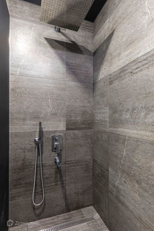 Современный санузел с огромным тропическим душем . Дизайнерское световое решение  в кухне - гостиной