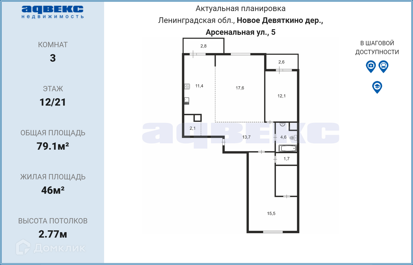3-комнатная квартира, 79.1 м2, этаж 12 / 21, на продажу в деревне Новое Девяткино, Арсенальная улица, 5